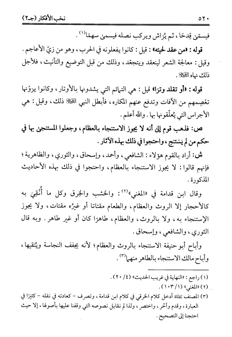 ص: فذهب قوم إلى أنه لا يجوز الاستنجاء بالعظام، وجعلوا المستنجى بها في حكم من لم يَسْتنج، واحتجوا في ذلك بهذه الآثار.