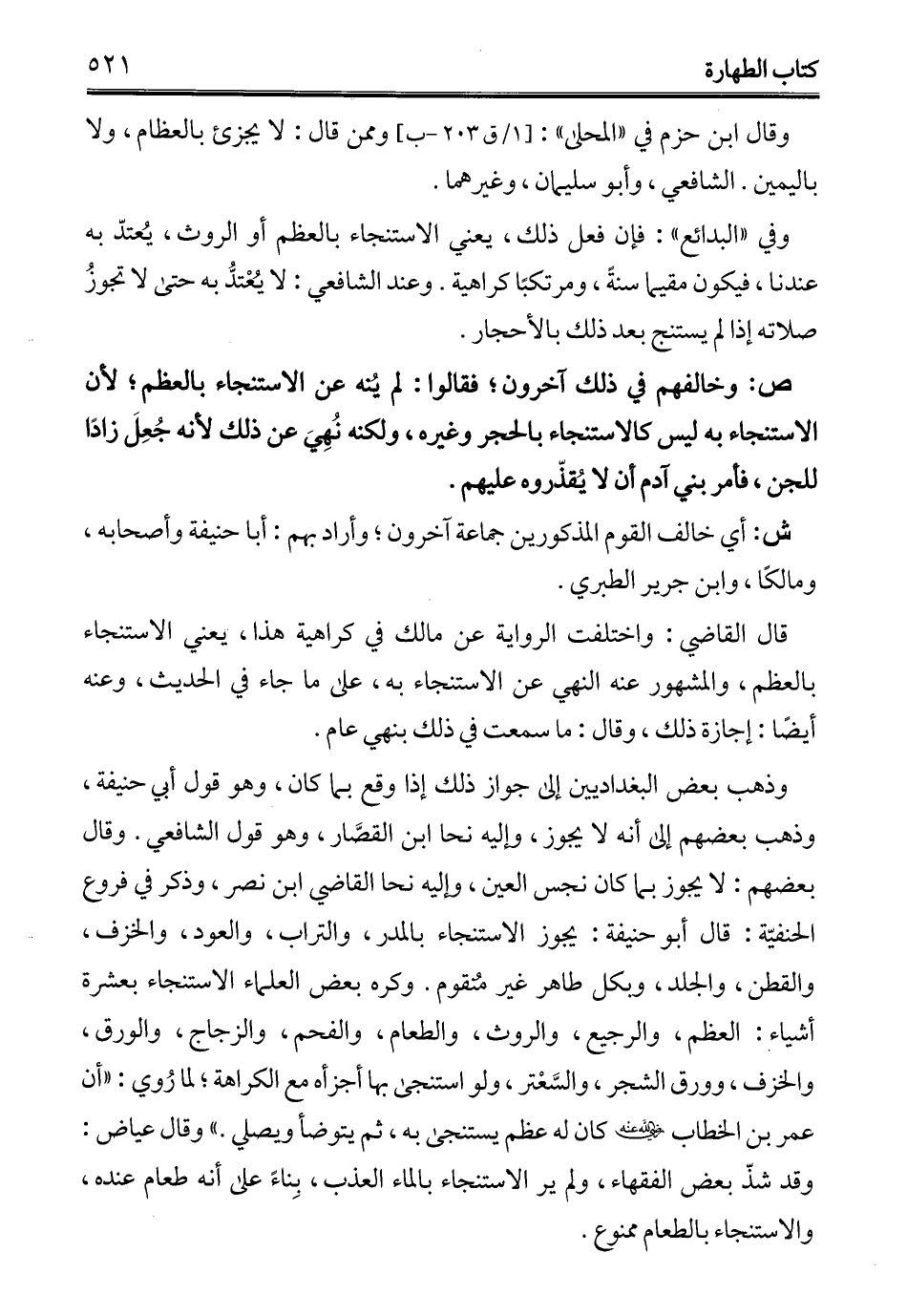 وفي "البدائع": فإن فعل ذلك، يعني الاستنجاء بالعظم أو الروث، يُعتدّ به عندنا، فيكون مقيما سنةً، ومرتكبًا كراهية. وعند الشافعي: لا يُعْتدُّ به حتى لا تجوزُ صلاته إذا لم يستنج بعد ذلك بالأحجار.