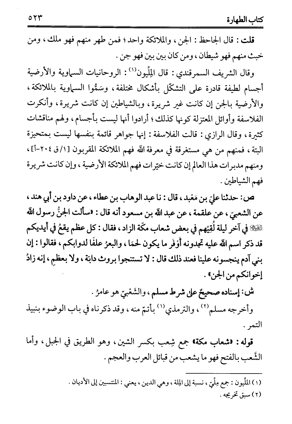 ص: حدثنا عليّ بن مَعْبد، قال: نا عبد الوهاب بن عطاء، عن داود بن أبي هند، عن الشعبيّ، عن علقمة، عن عبد الله بن مسعود أنه قال: "سألت الجنُّ رسول الله - عليه السلام - في آخر ليلة لُقِيِّهم في بعض شعاب مكّة الزاد، فقال: كل عظم يقعُ في أيديكم قد ذكر اسم الله عليه تجدونه أَوْفَر ما يكون لحمًا، والبعرُ علفًا لدوابكم، فقالوا: إن بني آدم ينجسونه علينا فعند ذلك قال: لا تستنجوا بروث دابّة، ولا بعظمٍ، إنه زادُ إخوانكم من الجن".