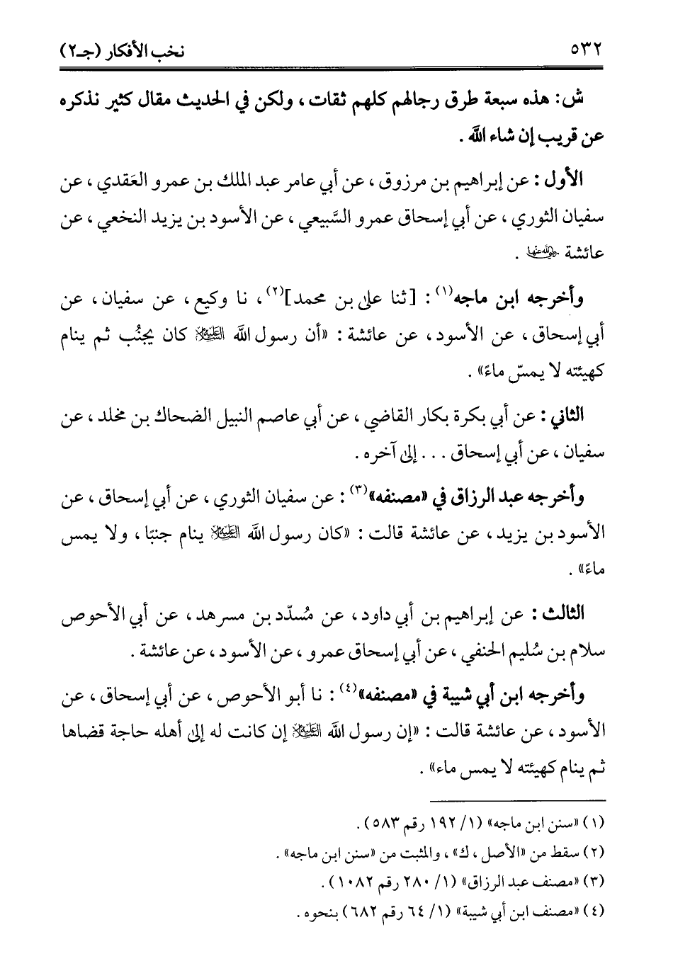 وأخرجه عبد الرزاق في "مصنفه" (¬3): عن سفيان الثوري، عن أبي إسحاق، عن الأسود بن يزيد، عن عائشة قالت: "كان رسول الله - عليه السلام - ينام جنبًا, ولا يمس ماءً".