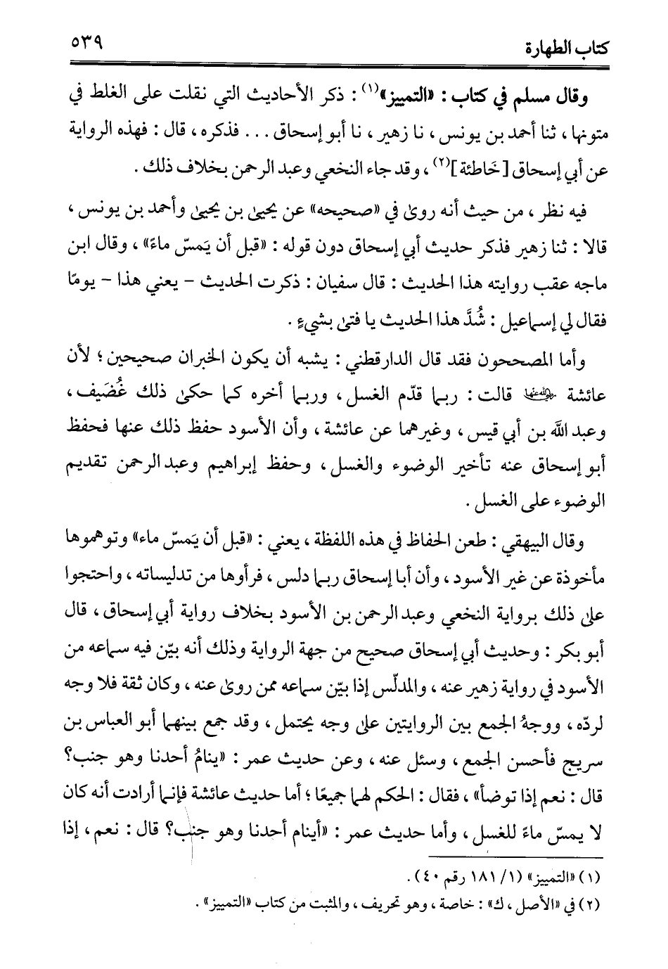 وقال مسلم في كتاب: "التمييز" (¬1): ذكر الأحاديث التي نقلت على الغلط في متونها، ثنا أحمد بن يونس، نا زهير، نا أبو إسحاق ... فذكره، قال: فهذه الرواية عن أبي إسحاق [خَاطئة] (¬2)، وقد جاء النخعي وعبد الرحمن بخلاف ذلك.