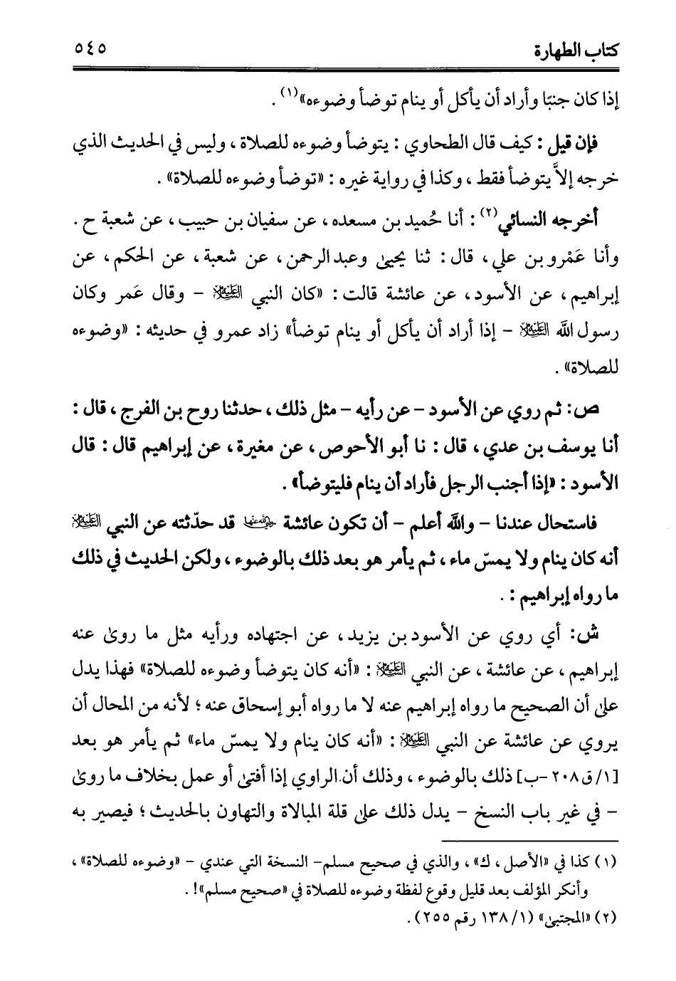 ش: أي روي عن الأسود بن يزيد، عن اجتهاده ورأيه مثل ما روى عنه إبراهيم، عن عائشة، عن النبي - عليه السلام -: "أنه كان يتوضأ وضوءه للصلاة" فهذا يدل على أن الصحيح ما رواه إبراهيم عنه لا ما رواه أبو إسحاق عنه؛ لأنه من المحال أن يروي عن عائشة عن النبي - عليه السلام -: "أنه كان ينام ولا يمسّ ماء" ثم يأمر هو بعد ذلك بالوضوء، وذلك أن. الراوي إذا أفتى أو عمل بخلاف ما روى -في غير باب النسخ- يدل ذلك على قلة المبالاة والتهاون بالحديث؛ فيصير به