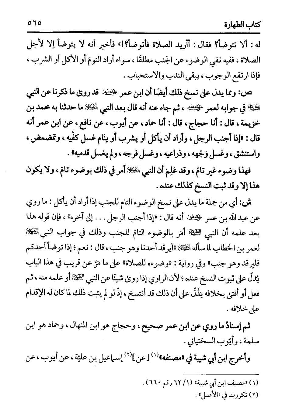 ص: ومما يدل على نسخ ذلك أيضًا أن ابن عمر - رضي الله عنهما - قد روى ما ذكرنا "عن النبي - عليه السلام - في جوابه لعمر - رضي الله عنه -، ثم جاء عنه أنه قال بعد النبي - عليه السلام - ما حدثنا به محمد بن خزيمة، قال: أنا حجاج، قال: أنا حماد، عن أيوب، عن نافع، عن ابن عمر أنه قال: "إذا أجنب الرجل، وأراد أن يأكل أو يشرب أو ينَام غسل كفَّيه، وتمضمض، واستنشق، وغسل وَجْهه، وذراعيه، وغسل فرجه، ولم يغسل قدميه".