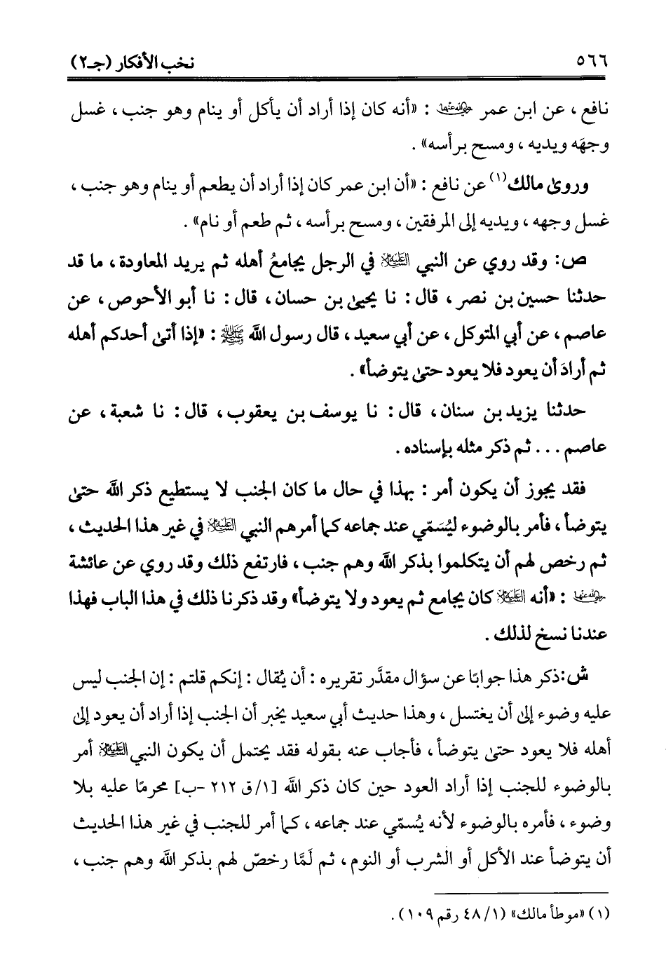 نافع، عن ابن عمر - رضي الله عنهما -: "أنه كان إذا أراد أن يأكل أو ينام وهو جنب، غسل وجهَه ويديه، ومسح برأسها".