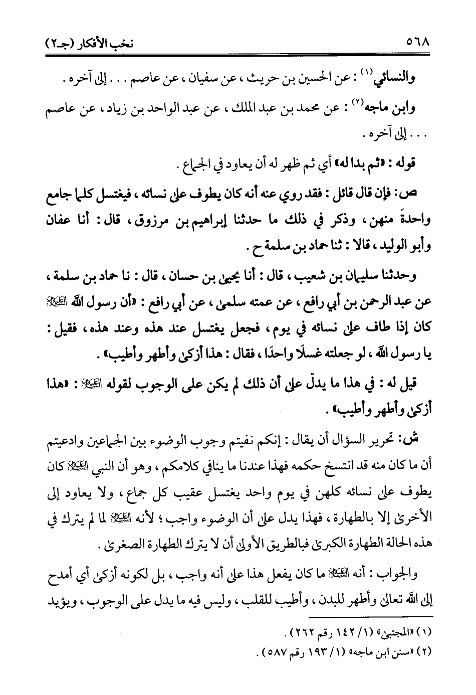 ش: تحرير السؤال أن يقال: إنكم نفيتم وجوب الوضوء بين الجماعين وادعيتم أن ما كان منه قد انتسخ حكمه فهذا عندنا ما ينافي كلامكم، وهو أن النبي - عليه السلام - كان يطوف على نسائه كلهن في يوم واحد يغتسل عقيب كل جماع، ولا يعاود إلى الأخرى إلا بالطهارة، فهذا يدل على أن الوضوء واجب؛ لأنه - عليه السلام - لما لم يترك في هذه الحالة الطهارة الكبرى فبالطريق الأولى أن لا يترك الطهارة الصغرى.