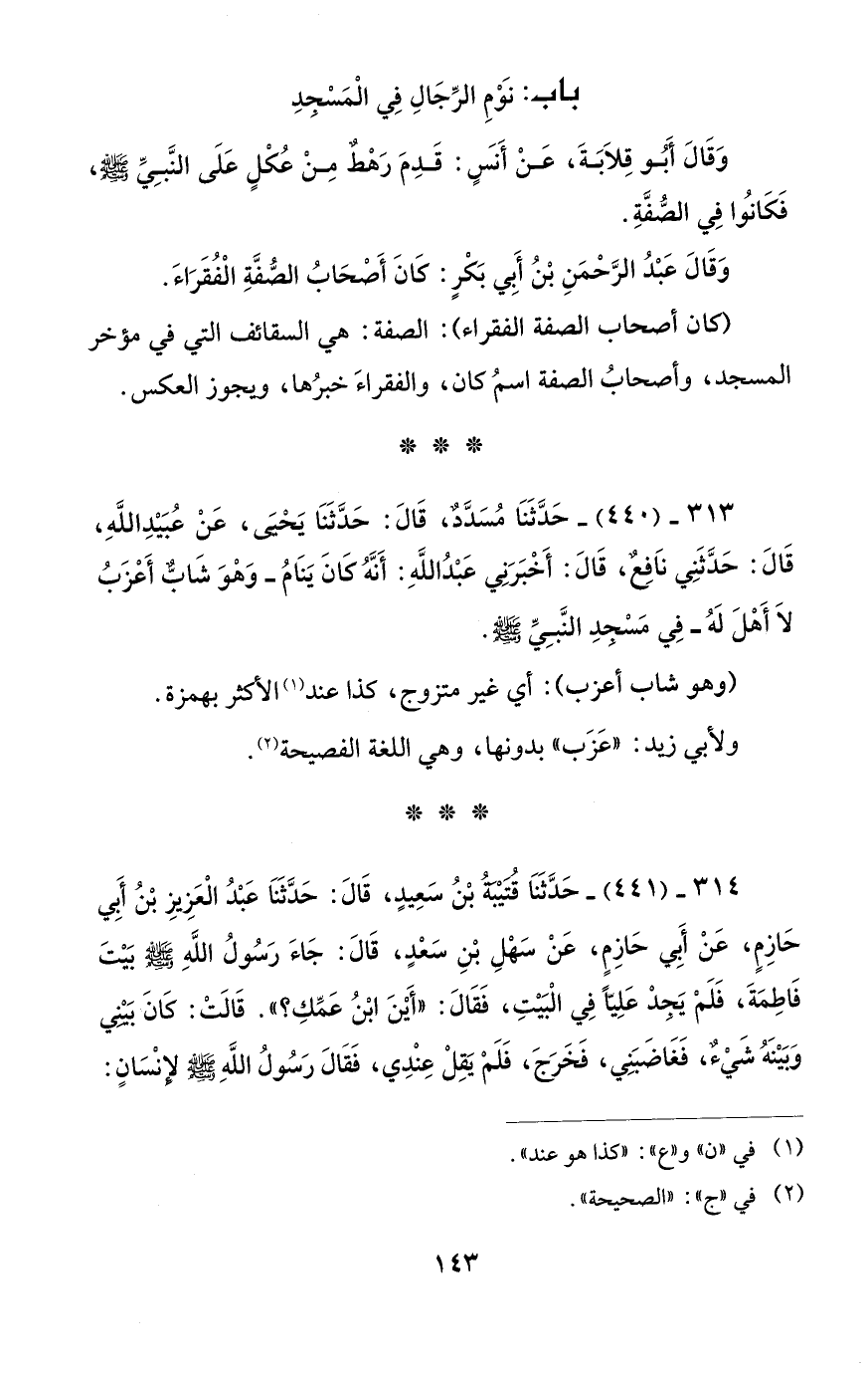 313 - (440) - حَدَّثَنَا مُسَدَّدٌ، قَالَ: حَدَّثَنَا يَحْيَى، عَنْ عُبَيْدِ اللَّهِ، قَالَ: حَدَّثَنِي نَافِعٌ، قَالَ: أَخْبَرَنِي عَبْدُ اللَّهِ: أَنَّهُ كَانَ يَنَامُ -وَهْوَ شَابٌّ أَعْزَبُ لاَ أَهْلَ لَهُ- فِي مَسْجدِ النَّبِيِّ - صلى الله عليه وسلم -.