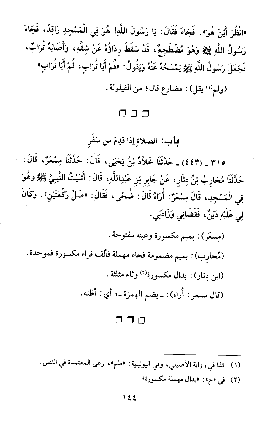 315 - (443) - حَدَّثَنَا خَلَّادُ بْنُ يَحْيَى، قَالَ: حَدَّثَنَا مِسْعَرٌ، قَالَ: حَدَّثَنَا مُحَارِبُ بْنُ دِثَارٍ، عَنْ جَابِرِ بْنِ عَبْدِ اللَّهِ، قَالَ: أَتَيْتُ النَّبِيَّ - صلى الله عليه وسلم - وَهُوَ فِي الْمَسْجدِ، قَالَ مِسْعَرٌ: أُرَاهُ قَالَ: ضُحًى، فَقَالَ: "صَلِّ رَكعَتَيْنِ". وَكَانَ لِي عَلَيْهِ دَيْنٌ، فَقَضَانِي وَزَادَنِي.