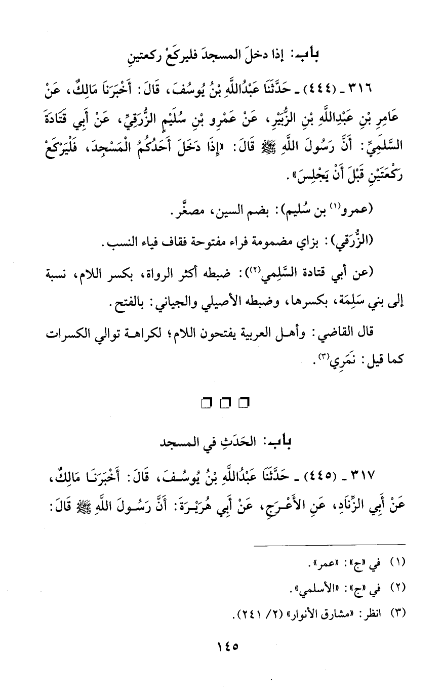 316 - (444) - حَدَّثَنَا عَبْدُ اللَّهِ بْنُ يُوسُفَ، قَالَ: أَخْبَرَنَا مَالِكٌ، عَنْ عَامِرِ بْنِ عَبْدِ اللَّهِ بْنِ الزُّبَيْرِ، عَنْ عَمْرِو بْنِ سُلَيْمٍ الزُّرَقِيِّ، عَنْ أَبي قتادَةَ السَّلَمِيَ: أَنَّ رَسُولَ اللَّهِ - صلى الله عليه وسلم - قَالَ: "إِذَا دَخَلَ أَحَدُكُمُ الْمَسْجِدَ، فَلْيَرْكَعْ رَكْعَتَيْنِ قَبْلَ أَنْ يَجْلِسَ".