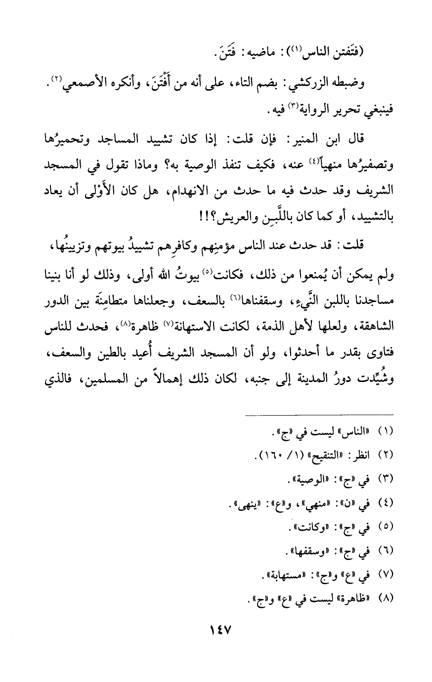 قلت: قد حدث عند الناس مؤمنِهم وكافرِهم تشييدُ بيوتهم وتزيينُها، ولم يمكن أن يُمنعوا من ذلك، فكانت (¬5) بيوتُ الله أولى، وذلك لو أنا بنينا مساجدنا باللبن النَّيءِ، وسقفناها (¬6) بالسعف، وجعلناها متطامِنَة بين الدور الشاهقة، ولعلها لأهل الذمة، لكانت الاستهانة (¬7) ظاهرة (¬8)، فحدث للناس فتاوى بقدر ما أحدثوا، ولو أن المسجد الشريف أُعيد بالطين والسعف، وشُيِّدت دورُ المدينة إلى جنبه، لكان ذلك إهمالًا من المسلمين، فالذي