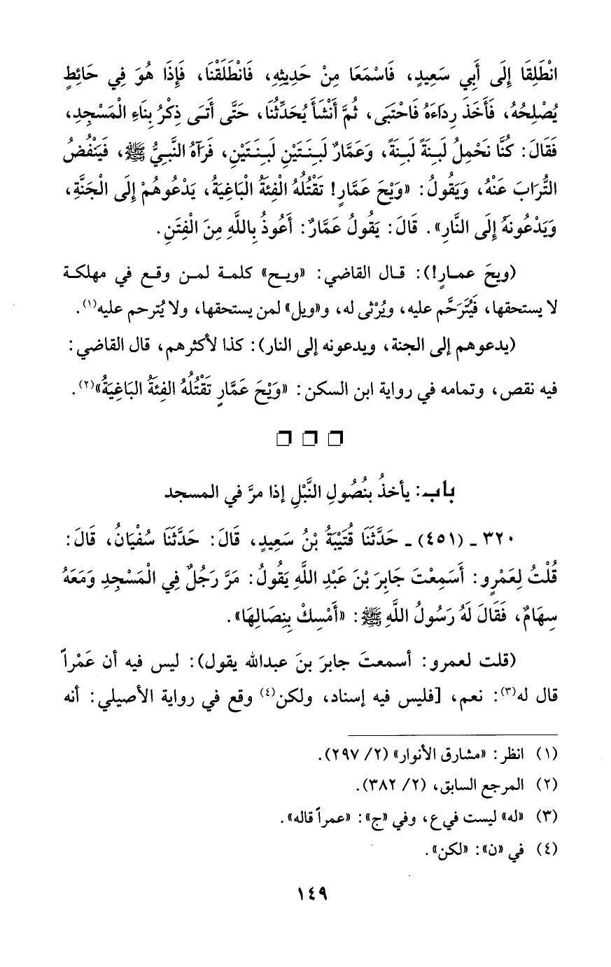 انْطَلِقَا إِلَى أَبي سَعِيدٍ، فَاسْمَعَا مِنْ حَدِيثهِ، فَانْطَلَقْنَا، فَإِذَا هُوَ فِي حَائِطٍ يُصْلِحُهُ، فَأَخَذَ رِدَاءَهُ فَاحْتَبَى، ثُمَّ أَنْشَأَ يُحَدِّثُنَا، حَتَّى أَتَى ذِكْرُ بِنَاءِ الْمَسْجِدِ، فَقَالَ: كُنَّا نَحْمِلُ لَبِنَةً لَبِنَةً، وَعَمَّارٌ لَبِنَتَيْنِ لَبِنَتَيْنِ، فَرَآهُ النَّبِيُّ - صلى الله عليه وسلم -، فَيَنْفُضُ التُّرَابَ عَنْهُ، وَيَقُولُ: "وَيْحَ عَمَّارٍ! تَقْتُلُهُ الْفِئَةُ الْبَاغِيَةُ، يَدْعُوهُمْ إِلَى الْجَنَّةِ، وَيَدْعُونَهُ إِلَى النَّارِ". قَالَ: يَقُولُ عَمَّارٌ: أَعُوذُ بِاللَّهِ مِنَ الْفِتَنِ.