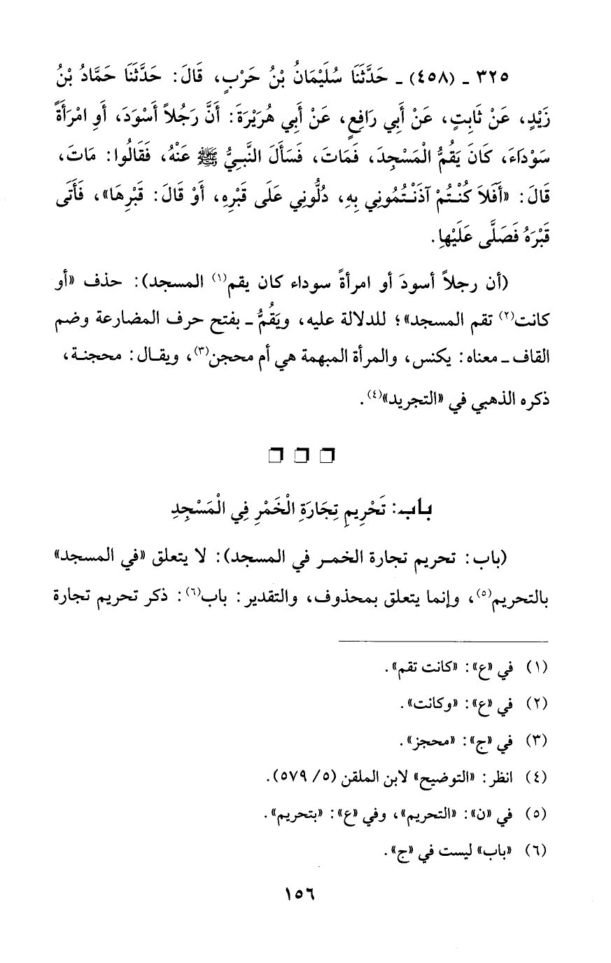 325 - (458) - حَدَّثَنَا سُلَيْمَانُ بْنُ حَرْبٍ، قَالَ: حَدَّثَنَا حَمَّادُ بْنُ زيدٍ، عَنْ ثَابِتٍ، عَنْ أَبِي رَافِعٍ، عَنْ أَبِي هُرَيْرَةَ: أَنَّ رَجُلًا أَسْوَدَ، أَوِ امْرَأَةً سَوْدَاءَ، كَانَ يَقُمُّ الْمَسْجِدَ، فَمَاتَ، فَسَأَلَ النَّبِيُّ - صلى الله عليه وسلم - عَنْهُ، فَقَالُوا: مَاتَ، قَالَ: "أَفَلاَ كُنْتُمْ آذَنْتُمُونِي بِهِ، دُلُّونِي عَلَى قَبْرِهِ، أَوْ قَالَ: قَبْرِهَا"، فَأَتَى قَبْرَهُ فَصَلَّى عَلَيْهاِ.