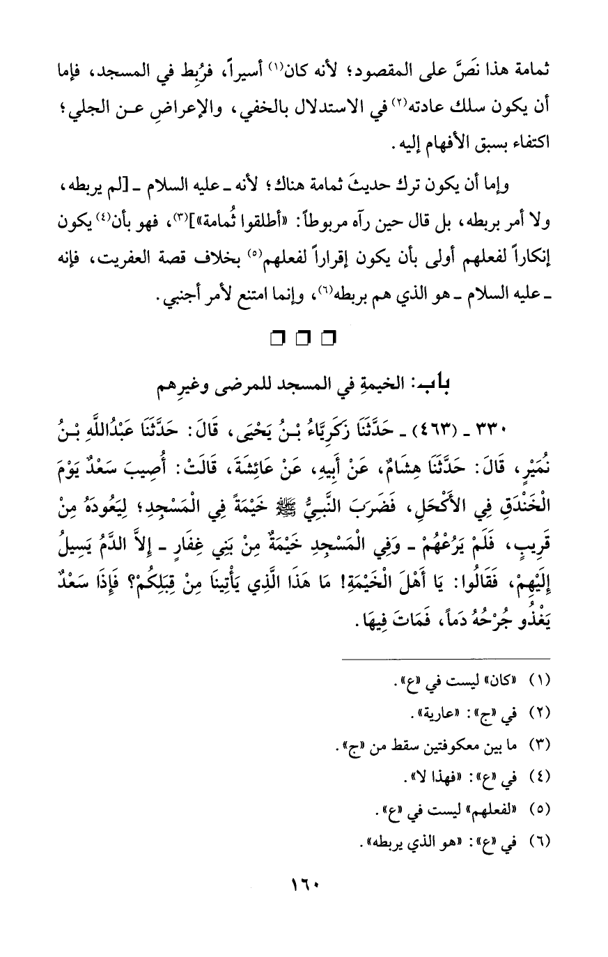 330 - (463) - حَدَّثَنَا زَكَرِيَّاءُ بْنُ يَحْيَى، قَالَ: حَدَّثَنَا عَبْدُ اللَّهِ بْنُ نُمَيْرٍ، قَالَ: حَدَّثَنَا هِشَامٌ، عَنْ أَبِيهِ، عَنْ عَائِشَةَ، قَالَتْ: أُصِيبَ سَعْدٌ يَوْمَ الْخَنْدَقِ فِي الأَكْحَلِ، فَضَرَبَ النَّبِيُّ - صلى الله عليه وسلم - خَيْمَةً فِي الْمَسْجِدِ؛ لِيَعُودَهُ مِنْ قَرِيبٍ، فَلَمْ يَرُعْهُمْ -وَفِي الْمَسْجدِ خَيْمَةٌ مِنْ بَنِي غِفَارٍ- إِلَّا الدَّمُ يَسِيلُ إِلَيْهِمْ، فَقَالُوا: يَا أَهْلَ الْخَيْمَةِ! مَا هَذَا الَّذِي يَأْتِينَا مِنْ قِبَلِكُمْ؟ فَإِذَا سَعْدٌ يَغْذُو جُرْحُهُ دَمًا، فَمَاتَ فِيهَا.