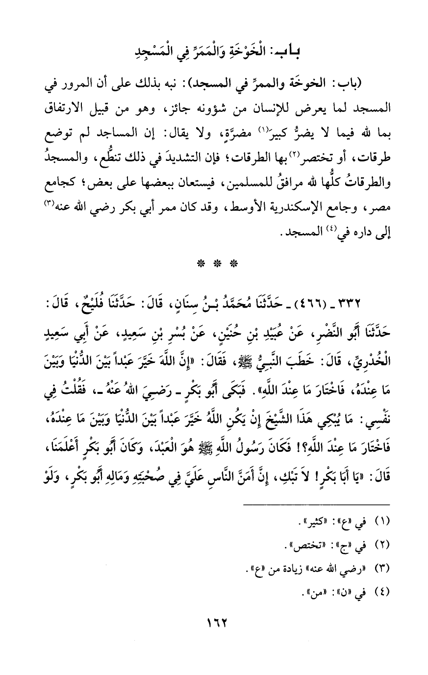 332 - (466) - حَدَّثَنَا مُحَمَّدُ بْنُ سِنَانٍ، قَالَ: حَدَّثَنَا فُلَيْحٌ، قَالَ: حَدَّثَنَا أَبُو النَّضْرِ، عَنْ عُبَيْدِ بْنِ حُنَيْنٍ، عَنْ بُسْرِ بْنِ سَعِيدٍ، عَنْ أَبي سَعِيدٍ الْخُدْرِيِّ، قَالَ: خَطَبَ النَّبِيُّ - صلى الله عليه وسلم -، فَقَالَ: "إِنَّ اللَّهَ خَيَّرَ عَبْدًا بَيْنَ الدُّنْيَا وَبَيْنَ مَا عِنْدَهُ، فَاخْتَارَ مَا عِنْدَ اللَّهِ". فَبَكَى أَبُو بَكْرٍ -رَضِيَ اللهُ عَنْهُ-، فَقُلْتُ فِي نفسِي: مَا يُبْكِي هَذَا الشَّيْخَ إِنْ يَكُنِ اللَّهُ خَيَّرَ عَبْدًا بَيْنَ الدُّنْيَا وَبَيْنَ مَا عِنْدَهُ، فَاخْتَارَ مَا عِنْدَ اللَّهِ؟! فَكَانَ رَسُولُ اللَّهِ - صلى الله عليه وسلم - هُوَ الْعَبْدَ، وَكانَ أَبُو بَكْرٍ أَعْلَمَنَا، قَالَ: "يَا أَبَا بَكْرٍ! لاَ تَبْكِ، إِنَّ أَمَنَّ النَّاسِ عَلَيَّ فِي صُحْبَتِهِ وَمَالِهِ أَبُو بَكْرٍ، وَلَوْ