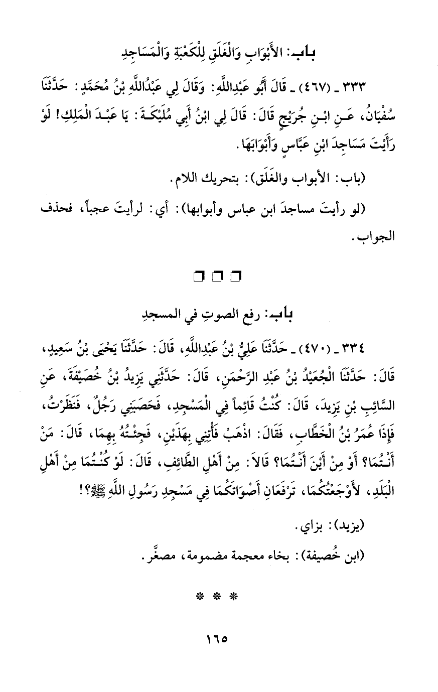 333 - (467) - قَالَ أَبُو عَبْدِ اللَّهِ: وَقَالَ لِي عَبْدُ اللَّهِ بْنُ مُحَمَّدٍ: حَدَّثَنَا سُفْيَانُ، عَنِ ابْنِ جُرَيْجٍ قَالَ: قَالَ لِي ابْنُ أَبِي مُلَيْكَةَ: يَا عَبْدَ الْمَلِكِ! لَوْ رَأَيْتَ مَسَاجِدَ ابْنِ عَبَّاسٍ وَأَبْوَابَهَا.