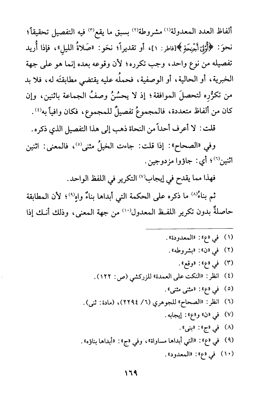 ألفاظ العدد المعدولة (¬1) مشروطة (¬2) بسبق ما يقع (¬3) فيه التفصيل تحقيقًا؛ نحوَ: {أُولِي أَجْنِحَةٍ} [فاطر: 1]، أو تقديرًا؛ نحَو: "صَلاةُ الليلِ"، فإذا أُريد تفصيله من نوع واحد، وجب تكرره؛ لأن وقوعه بعده إنما هو على جهة الخبرية، أو الحالية، أو الوصفية، فحملُه عليه يقتضي مطابقتَه له، فلا بد من تكرُّرِه لتحصلَ الموافقة؛ إذ لا يحسُنُ وصفُ الجماعة باثنين، وإن كان من ألفاظ متعددة، فالمجموعُ تفصيلٌ للمجموع، فكان وافيًا به (¬4).