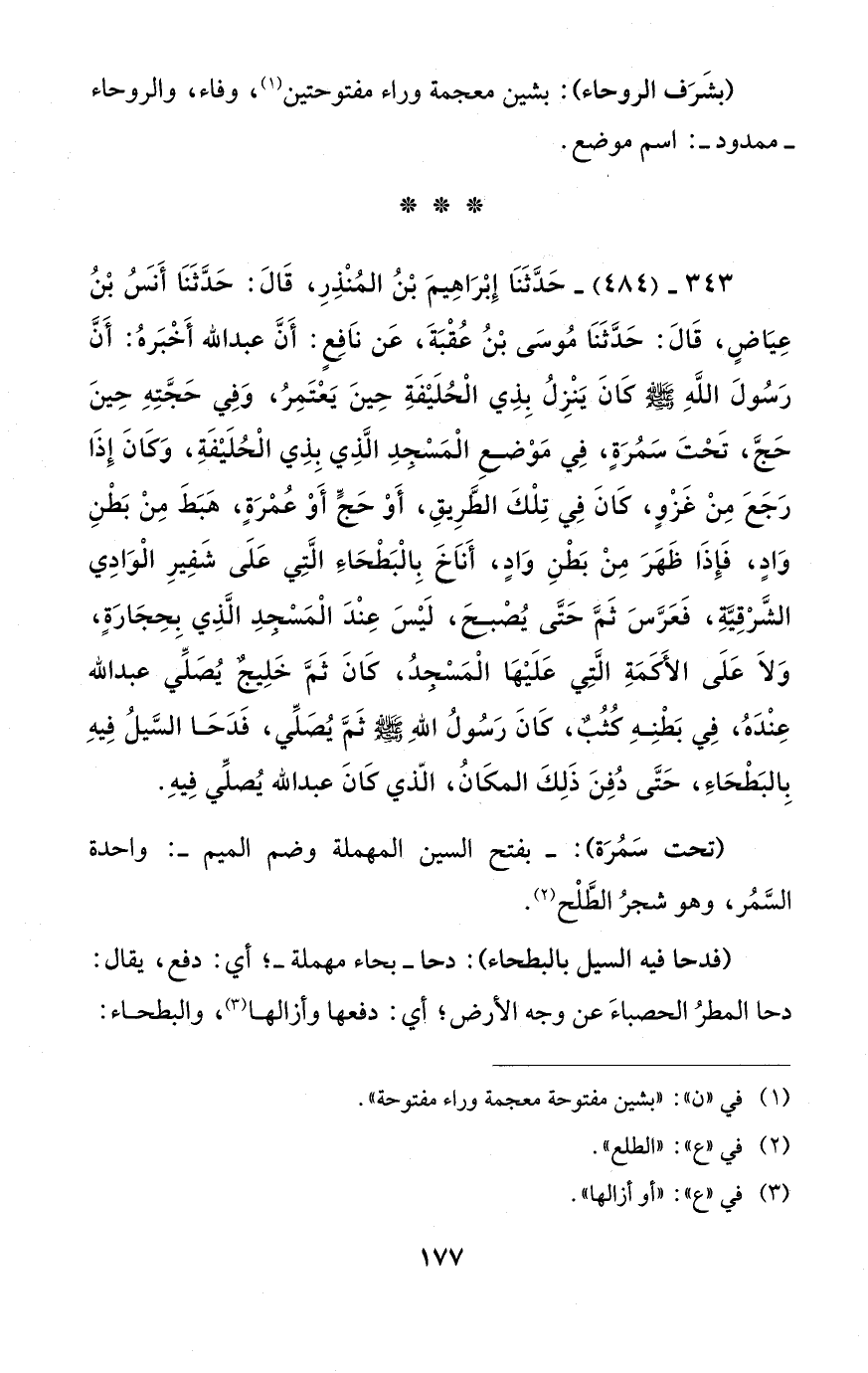 343 - (484) - حَدَّثَنَا إِبْرَاهِيمَ بْنُ المُنْذِرِ، قَالَ: حَدَّثَنَا أَنسُ بْنُ عِيَاضٍ، قَالَ: حَدَّثَنَا مُوسَى بْنُ عُقْبَةَ، عَن نَافِعٍ: أَنَّ عبد الله أَخْبَرهُ: أَنَّ رَسُولَ اللَّهِ - صلى الله عليه وسلم - كَانَ يَنْزِلُ بِذِي الْحُلَيْفَةِ حِينَ يَعْتَمِرُ، وَفِي حَجَّتِهِ حِينَ حَجَّ، تَحْتَ سَمُرَةٍ، فِي مَوْضعِ الْمَسْجِدِ الَّذِي بِذِي الْحُلَيْفَةِ، وَكَانَ إِذَا رَجَعَ مِنْ غَزْوٍ، كَانَ فِي تِلْكَ الطَّرِيقِ، أَوْ حَجٍّ أَوْ عُمْرَةٍ، هَبَطَ مِنْ بَطْنِ وَادٍ، فَإِذَا ظَهَرَ مِنْ بَطْنِ وَادٍ، أَنَاخَ بِالْبَطْحَاءِ الَّتِي عَلَى شَفِيرِ الْوَادِي الشَّرْقِيَّةِ، فَعَرَّسَ ثَمَّ حَتَّى يُصْبحَ، لَيْسَ عِنْدَ الْمَسْجِدِ الَّذِي بحِجَارَةٍ، وَلاَ عَلَى الأَكَمَةِ الَّتِي عَلَيْهَا الْمَسْجدُ، كَانَ ثَمَّ خَلِيجٌ يُصَلِّي عبد الله عِنْدَهُ، فِي بَطْنِهِ كُثُبٌ، كَانَ رَسُولُ اللهِ - صلى الله عليه وسلم - ثَمَّ يُصَلِّي، فَدَحَا السَّيلُ فِيهِ بِالبَطْحَاءِ، حَتَّى دُفِنَ ذَلِكَ المكَانُ، الّذي كَانَ عبد الله يُصلِّي فِيهِ.