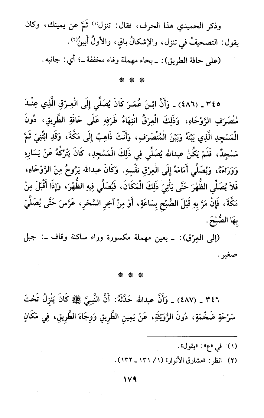 345 - (486) - وَأَنَّ ابْنَ عُمَرَ كَانَ يُصَلِّي إِلَى الْعِرْقِ الَّذِي عِنْدَ مُنْصَرَفِ الرَّوْحَاءَ، وَذَلِكَ الْعِرْقُ انْتِهَاءُ طَرَفِهِ عَلَى حَافَةِ الطَّرِيقِ، دُونَ الْمَسْجِدِ الَّذِي بَيْنَهُ وَبَيْنَ الْمُنْصَرَفِ، وَأَنْتَ ذَاهِبٌ إِلَى مَكَّةَ، وَقَدِ ابْتُنِيَ ثَمَّ مَسْجِدٌ، فَلَمْ يَكُنْ عبد الله يُصَلِّي فِي ذَلِكَ الْمَسْجِدِ، كَانَ يَتْرُكُهُ عَنْ يَسَارِهِ وَوَرَاءَهُ، ويُصَلِّي أَمَامَهُ إِلَى الْعِرْقِ نَفْسِهِ. وَكَانَ عبد الله يَرُوحُ مِنَ الرَّوْحَاءَ، فَلاَ يُصَلِّي الظُّهْرَ حَتَّى يَأْتِيَ ذَلِكَ الْمَكَانَ، فَيُصَلِّي فِيهِ الظُّهْرَ، وَاِذَا أَقْبَلَ مِنْ مَكَّةَ، فَإِنْ مَرَّ بِهِ قَبْلَ الصُّبْحِ بِسَاعَةٍ، أَوْ مِنْ آخِرِ السَّحَرِ، عَرَّسَ حَتَّى يُصَلِّيَ بِهَا الصُّبْحَ.
