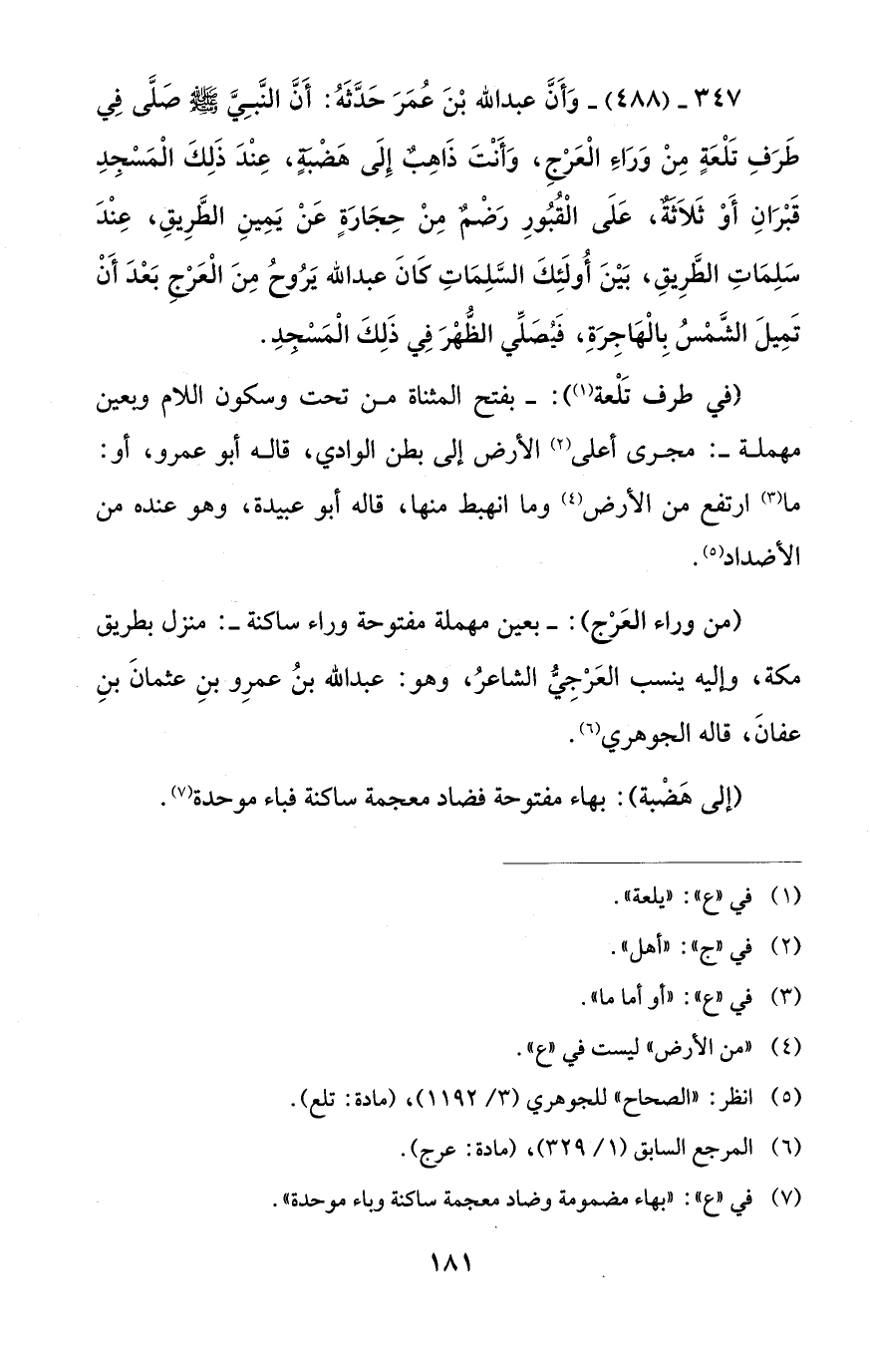 347 - (488) - وَأَنَّ عبد الله بْنَ عُمَرَ حَدَّثَهُ: أَنَّ النَّبِيَّ - صلى الله عليه وسلم - صَلَّى فِي طَرَفِ تَلْعَةٍ مِنْ وَرَاءِ الْعَرْجِ، وَأَنْتَ ذَاهِبٌ إِلَى هَضْبَةٍ، عِنْدَ ذَلِكَ الْمَسْجِدِ قَبْرَانِ أَوْ ثَلاَثَةٌ، عَلَى الْقُبُورِ رَضْمٌ مِنْ حِجَارَةٍ عَنْ يَمِينِ الطَّرِيقِ، عِنْدَ سَلِمَاتِ الطَّرِيقِ، بَيْنَ أُولَئِكَ السَّلِمَاتِ كَانَ عبد الله يَرُوحُ مِنَ الْعَرْجِ بَعْدَ أَنْ تَمِيلَ الشَّمْسُ بِالْهَاجِرَةِ، فَيُصَلِّي الظُّهْرَ فِي ذَلِكَ الْمَسْجدِ.