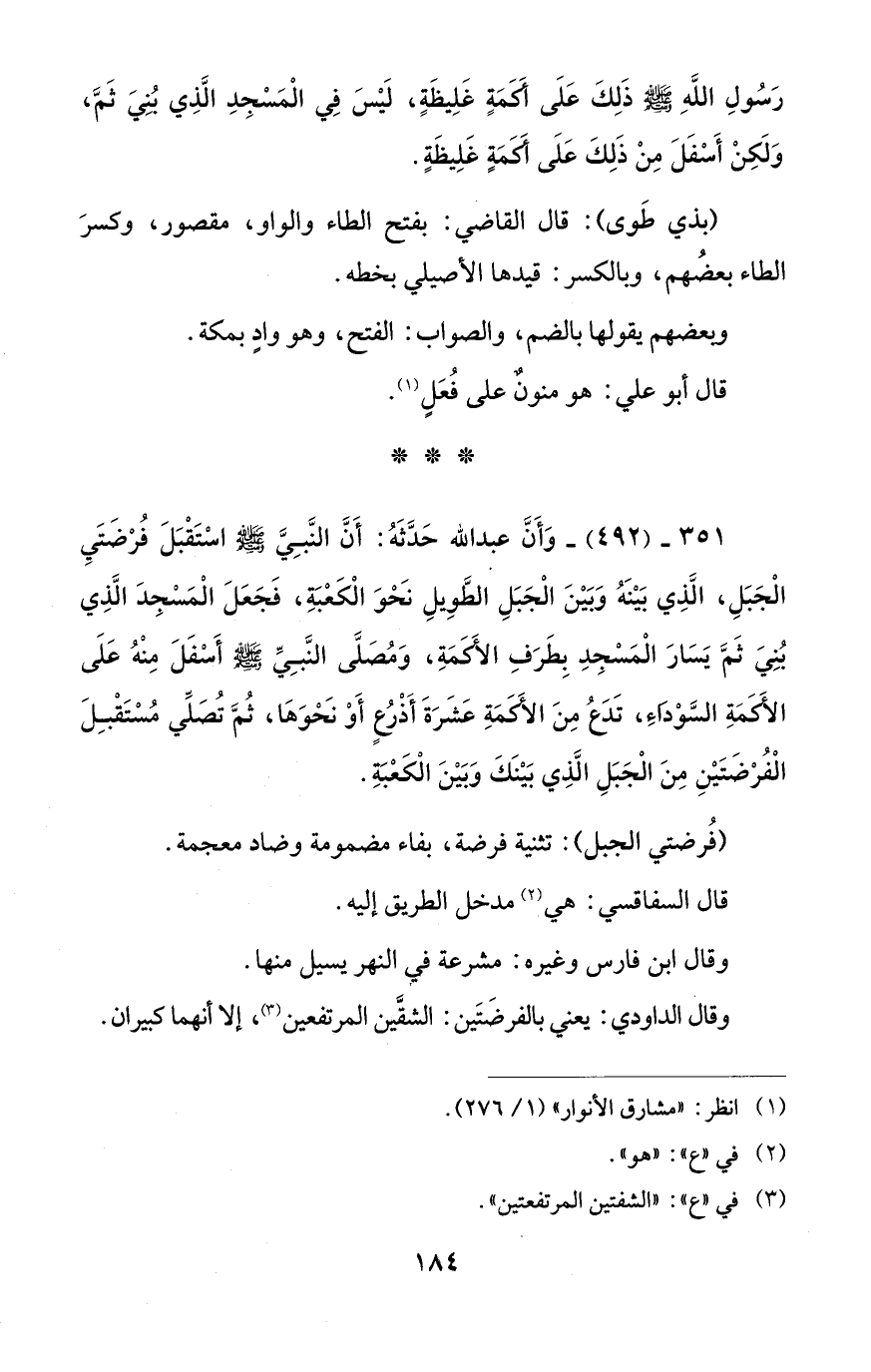 351 - (492) - وَأَنَّ عبد الله حَدَّثَهُ: أَنَّ النَّبِيَّ - صلى الله عليه وسلم - اسْتَقْبَلَ فُرْضَتَيِ الْجَبَلِ، الَّذِي بَيْنَهُ وَبَيْنَ الْجَبَلِ الطَّوِيلِ نَحْوَ الْكَعْبَةِ، فَجَعَلَ الْمَسْجِدَ الَّذِي بُنِيَ ثَمَّ يَسَارَ الْمَسْجِدِ بِطَرَفِ الأَكَمَةِ، وَمُصَلَّى النَّبِيَّ - صلى الله عليه وسلم - أَسْفَلَ مِنْهُ عَلَى الأَكَمَةِ السَّوْدَاءِ، تَدَعُ مِنَ الأكَمَةِ عَشَرَةَ أَذْرُعٍ أَوْ نَحْوَهَا، ثُمَّ تُصَلِّي مُسْتَقْبِلَ الْفُرْضَتَيْنِ مِنَ الْجَبَلِ الَّذِي بَيْنَكَ وَبَيْنَ الْكَعْبَةِ.