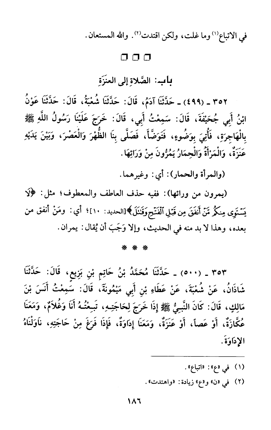 352 - (499) - حَدَّثَنَا آدَمُ، قَالَ: حَدَّثَنَا شُعْبَةُ، قَالَ: حَدَّثَنَا عَوْنُ ابنُ أَبِي جُحَيْفَةَ، قَالَ: سَمِعْتُ أَبِي، قَالَ: خَرَجَ عَلَيْنَا رَسُولُ اللَّهِ - صلى الله عليه وسلم - بِالْهَاجِرَةِ، فَأُتِيَ بِوَضُوءٍ، فَتَوَضَّأَ، فَصَلَّى بِنَا الظُّهْرَ وَالْعَصْرَ، وَبَيْنَ يَدَيْهِ عَنَزَةٌ، وَالْمَرْأة وَالْحِمَارُ يَمُرُّونَ مِنْ وَرَائِهَا.