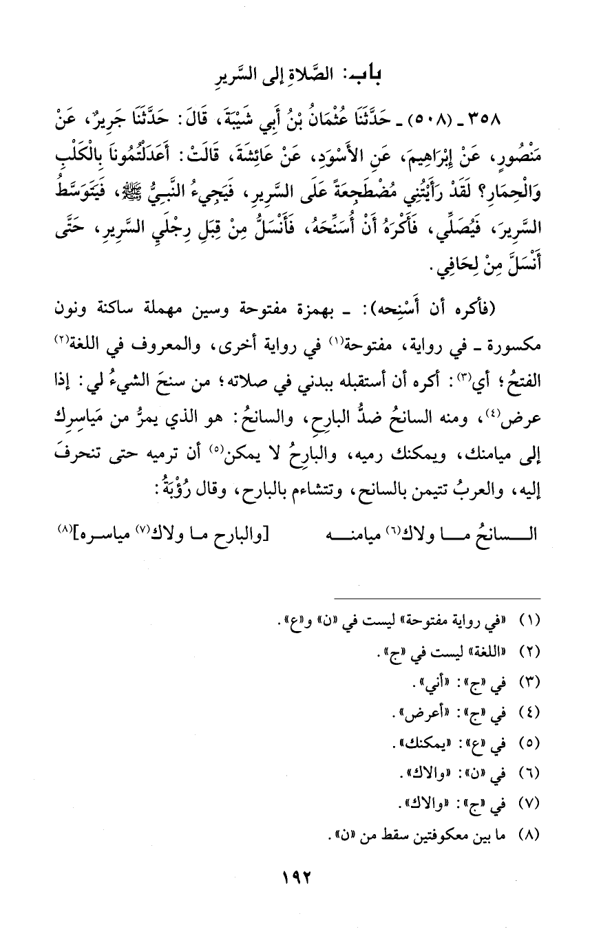 358 - (508) - حَدَّثَنَا عُثْمَانُ بْنُ أَبِي شَيْبَةَ، قَالَ: حَدَّثَنَا جَرِيرٌ، عَنْ مَنْصُورٍ، عَنْ إِبْرَاهِيمَ، عَنِ الأَسْوَدِ، عَنْ عَائِشَةَ، قَالَتْ: أَعَدَلْتُمُوناَ بِالْكَلْبِ وَالْحِمَارِ؟ لَقَدْ رَأَيْتُنِي مُضْطَجعَةً عَلَى السَّرِيرِ، فَيَجيءُ النَّبِيُّ - صلى الله عليه وسلم -، فَيَتَوَسَّطُ السَّرِيرَ، فَيُصَلِّي، فَأَكْرَهُ أَنْ أُسَنِّحَهُ، فَأَنْسَلُّ مِنْ قِبَلِ رِجْلَيِ السَّرِيرِ، حَتَّى أَنْسَلَّ مِنْ لِحَافِي.