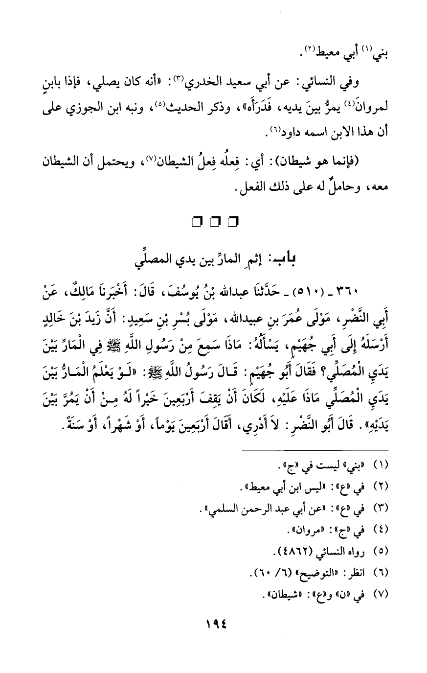 360 - (510) - حَدَّثنَا عبد الله بْنُ يُوسُفَ، قَالَ: أَخْبَرناَ مَالِكٌ، عَنْ أَبِي النَّضْرِ، مَوْلَى عُمَرَ بنِ عبيد الله، مَوْلَى بُسْرِ بْنِ سَعِيدٍ: أَنَّ زَيدَ بْنَ خَالِدٍ أَرْسَلَهُ إِلَى أَبِي جُهَيْمِ، يَسْأَلُهُ: مَاذَا سَمِعَ مِنْ رَسُولِ اللَّهِ - صلى الله عليه وسلم - فِي الْمَارِّ بَيْنَ يَدَيِ الْمُصَلِّي؟ فَقَالَ أَبُو جُهَيْمِ: قَالَ رَسُولُ اللَّهِ - صلى الله عليه وسلم -: "لَوْ يَعْلَمُ الْمَارُّ بَيْنَ يَدَيِ الْمُصَلِّي مَاذَا عَلَيْهِ، لَكَانَ أَنْ يَقِفَ أَرْبَعِينَ خَيْرًا لَهُ مِنْ أَنْ يَمُرَّ بَيْنَ يَدَيْهِ". قَالَ أَبُو النَّضْرِ: لاَ أَدْرِي، أَقَالَ أَرْبَعِينَ يَوْمًا، أَوْ شَهْرًا، أَوْ سَنَةً.
