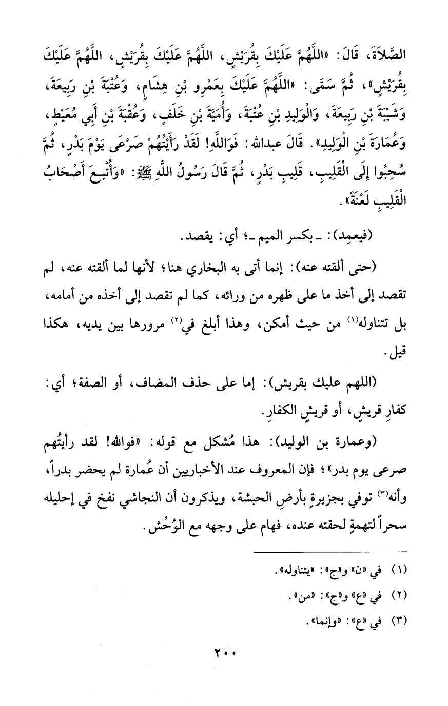 الصَّلاَةَ، قَالَ: "اللَّهُمَّ عَلَيْكَ بِقُرَيْشٍ، اللَّهُمَّ عَلَيْكَ بِقُرَيْشٍ، اللَّهُمَّ عَلَيْكَ بِقُرَيْشٍ"، ثُمَّ سَمَّى: "اللَّهُمَّ عَلَيْكَ بِعَمْرِو بْنِ هِشَامٍ، وَعُتْبَةَ بْنِ رَبِيعَةَ، وَشَيْبَةَ بْنِ رَبِيعَةَ، وَالْوَليدِ بْنِ عُتْبَةَ، وَأُمَيَّةَ بْنِ خَلَفٍ، وَعُقْبَةَ بْنِ أَبي مُعَيْطٍ، وَعُمَارَةَ بْنِ الْوَلِيدِ". قَالَ عبد الله: فَوَاللَّهِ! لَقَدْ رَأَيْتُهُمْ صَرْعَى يَوْمَ بَدْرٍ، ثُمَّ سُحِبُوا إِلَى الْقَلِيبِ، قَلِيبِ بَدْرٍ، ثُمَّ قَالَ رَسُولُ اللَّهِ - صلى الله عليه وسلم -: "وَأُتْبعَ أَصْحَابُ الْقَلِيبِ لَعْنَةً".