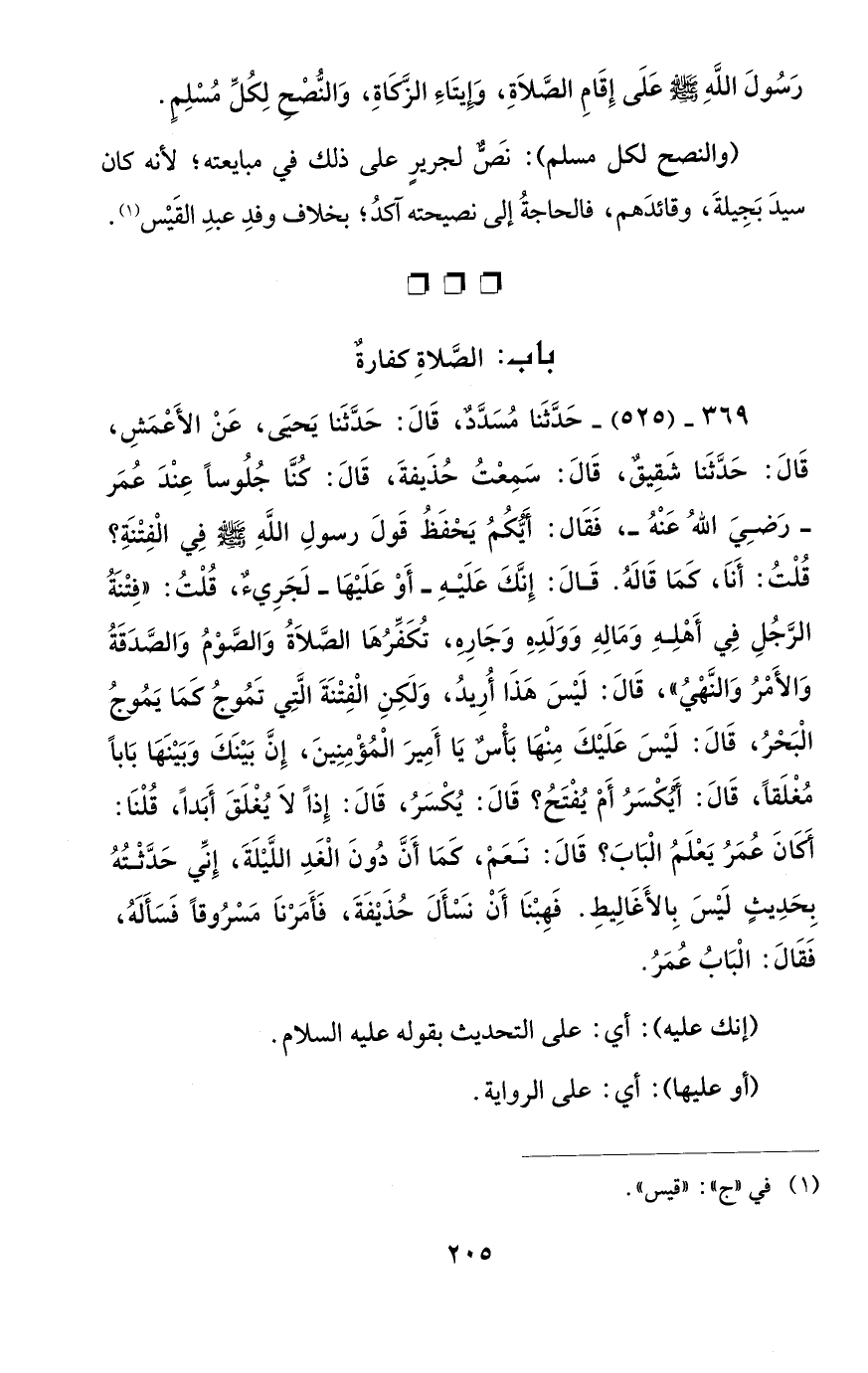 369 - (525) - حَدَّثَنا مُسَدَّدٌ، قَالَ: حَدَّثَنا يَحيَى، عَنْ الأَعْمَشِ، قَالَ: حَدَّثَنا شَقِيقٌ، قَالَ: سَمِعْتُ حُذَيفةَ، قَالَ: كنَّا جُلُوسًا عِنْدَ عُمَر -رَضِيَ اللهُ عَنْهُ-، فَقَال: أَيُّكُمُ يَحْفَظُ قَولَ رسولِ اللَّهِ - صلى الله عليه وسلم - في الْفِتْنَةِ؟ قُلْتُ: أَناَ، كَمَا قَالَهُ. قَالَ: إِنَّكَ عَلَيْهِ -أَوْ عَلَيْهَا- لَجَرِيءٌ، قُلْتُ: "فِتْنَةُ الرَّجُلِ فِي أَهْلِهِ وَمَالِهِ وَوَلَدِهِ وَجَارِهِ، تُكَفِّرُهَا الصَّلاَةُ وَالصَّوْمُ وَالصَّدَقَةُ وَالأَمْرُ وَالنَّهْيُ"، قَالَ: لَيْسَ هَذَا أُرِيدُ، وَلَكِنِ الْفِتْنَةَ الَّتِي تَمُوجُ كمَا يَمُوجُ الْبَحْرُ، قَالَ: لَيْسَ عَلَيْكَ مِنْهَا بَأْسٌ يَا أَمِيرَ الْمُؤْمِنِينَ، إِنَّ بَيْنَكَ وَبَيْنَهَا بَابًا مُغْلَقًا، قَالَ: أَيُكْسَرُ أَمْ يُفْتَحُ؟ قَالَ: يُكْسَرُ، قَالَ: إِذًا لاَ يُغْلَقَ أَبَدًا، قُلْنَا: أَكَانَ عُمَرُ يَعْلَمُ الْبَابَ؟ قَالَ: نَعَمْ، كمَا أَنَّ دُونَ الْغَدِ اللَّيْلَةَ، إِنِّي حَدَّثْتُهُ بِحَدِيثٍ لَيْسَ بِالأَغَالِيطِ. فَهِبْنَا أَنْ نسأَلَ حُذَيْفَةَ، فَأَمَرْناَ مَسْرُوقًا فَسَأَلَهُ، فَقَالَ: الْبَابُ عُمَرُ.