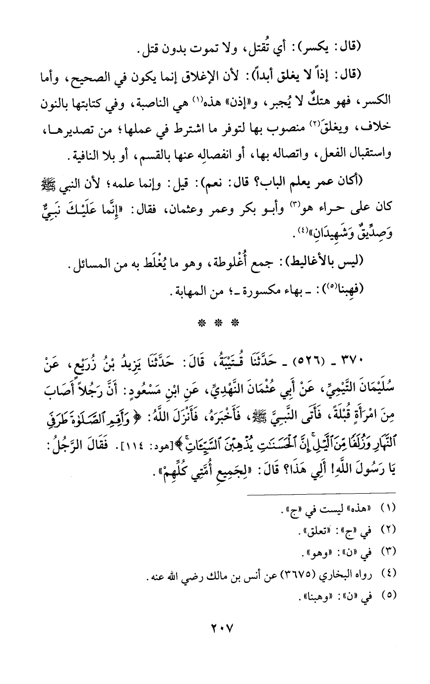 370 - (526) - حَدَّثَنَا قُتَيْبَةُ، قَالَ: حَدَّثَنَا يَزِيدُ بْنُ زُرَيْعٍ، عَنْ سُلَيْمَانَ التَّيْمِيِّ، عَنْ أَبي عُثْمَانَ النَّهْدِيِّ، عَنِ ابْنِ مَسْعُودٍ: أَنَّ رَجُلًا أَصَابَ مِنَ امْرَأَةٍ قُبْلَةً، فَأَتَى النَّبِيَّ - صلى الله عليه وسلم -، فَأَخْبَرَهُ، فَأَنْزَلَ اللَّهُ: {وَأَقِمِ الصَّلَاةَ طَرَفَيِ النَّهَارِ وَزُلَفًا مِنَ اللَّيْلِ إِنَّ الْحَسَنَاتِ يُذْهِبْنَ السَّيِّئَاتِ ذَلِكَ ذِكْرَى لِلذَّاكِرِينَ} [هود: 114]. فَقَالَ الرَّجُلُ: يَا رَسُولَ اللَّهِ! أَلِي هَذَا؟ قَالَ: "لِجَمِيعِ أُمَّتِي كلِّهِمْ".