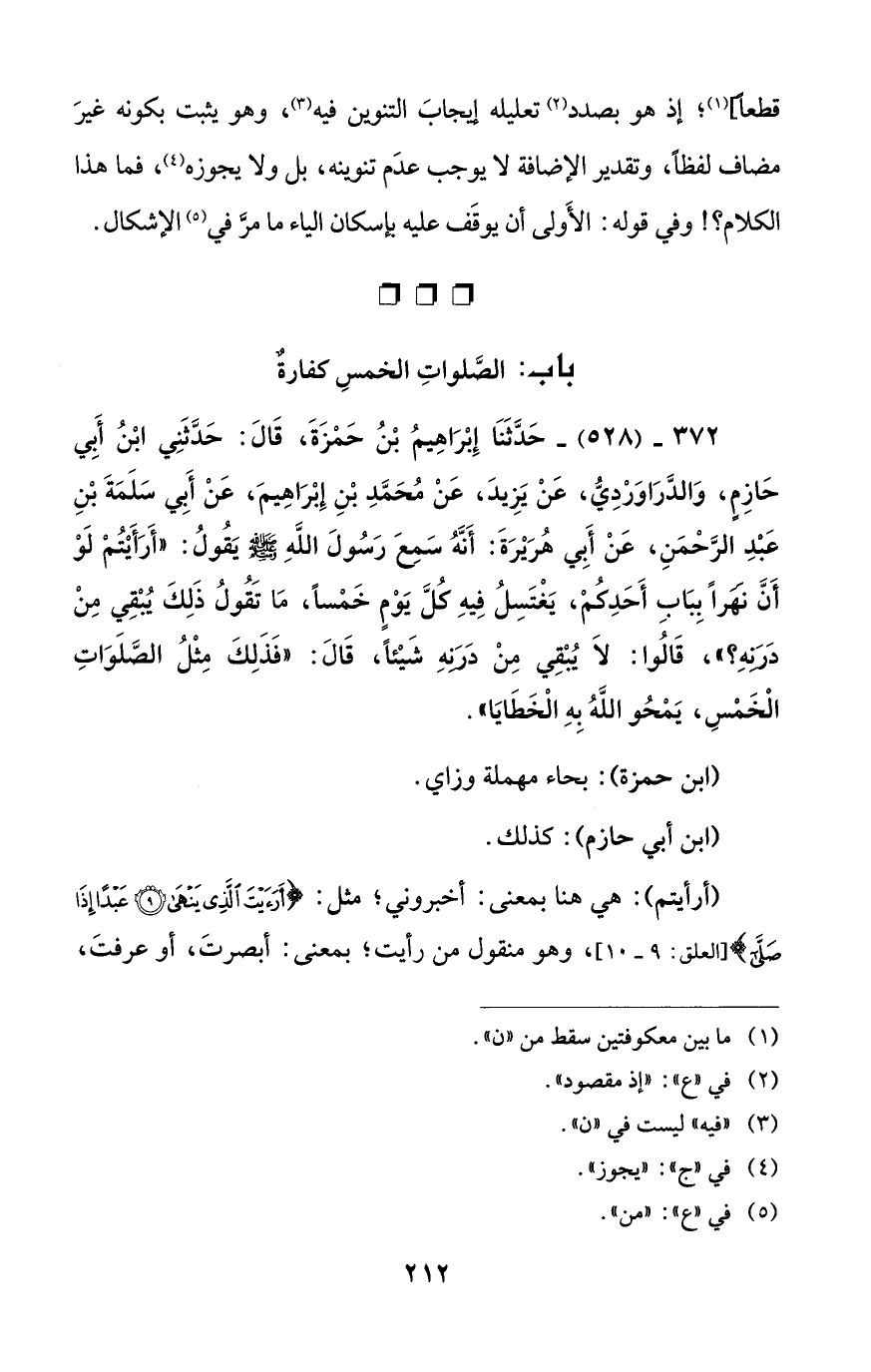 372 - (528) - حَدَّثَنَا إِبْرَاهِيمُ بْنُ حَمْزَةَ، قَالَ: حَدَّثَنِي ابْنُ أَبِي حَازِمٍ، وَالدَّرَاوَرْدِيُّ، عَنْ يَزِيدَ، عَنْ مُحَمَّدِ بْنِ إِبْرَاهِيمَ، عَنْ أَبِي سَلَمَةَ بْنِ عَبْدِ الرَّحْمَنِ، عَنْ أَبي هُرَيْرَةَ: أَنَّهُ سَمِعَ رَسُولَ اللهِ - صلى الله عليه وسلم - يَقُولُ: "أَرَأَيْتُمْ لَوْ أَنَّ نهَرًا بِبَابِ أَحَدِكُمْ، يَغْتَسِلُ فِيهِ كُلَّ يَوْمٍ خَمْسًا، مَا تَقُولُ ذَلِكَ يُبْقِي مِنْ دَرَنهِ؟ "، قَالُوا: لا يُبْقِي مِنْ دَرَنهِ شَيْئًا، قَالَ: "فَذَلِكَ مِثْلُ الصَّلَوَاتِ الْخَمْسِ، يَمْحُو الله بِهِ الْخَطَايَا".