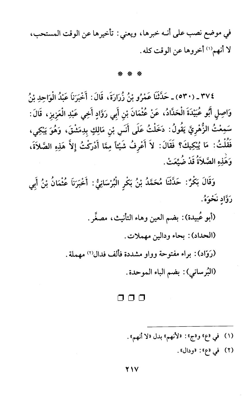 374 - (530) - حَدَّثَنَا عَمْرُو بْنُ زُرَارَةَ، قَالَ: أَخْبَرَنَا عَبْدُ الْوَاحِدِ بْنُ وَاصِلٍ أَبُو عُبَيْدَةَ الْحَدَّادُ، عَنْ عُثْمَانَ بْنِ أَبي رَوَّادٍ أَخِي عَبْدِ الْعَزِيزِ، قَالَ: سَمِعْتُ الزُّهْرِيَّ يَقُولُ: دَخَلْتُ عَلَى أَنَسِ بْنِ مَالِكٍ بِدِمَشْقَ، وَهُوَ يَبْكِي، فَقُلْتُ: مَا يُبْكِيكَ؟ فَقَالَ: لا أَعْرِفُ شَيْئًا مِمَّا أَدْرَكتُ إلا هَذِهِ الصَّلَاةَ، وَهَذِهِ الصَّلَاةُ قَدْ ضُيِّعَتْ.