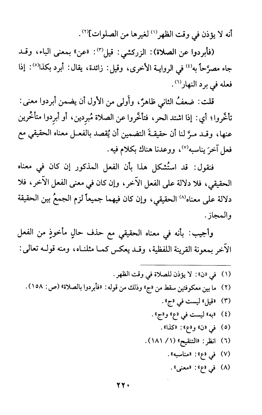 قلت: ضعفُ الثاني ظاهرٌ، وأَولى من الأول أن يضمن أبردوا معنى: تصحَّروا؛ أي: إذا اشتد الحُر، فتأخَّروا عن الصلاة مُبرِدين، أو أبرِدوا متأخِّرين عنها، وقد مرَّ لنا أن حقيقةَ التضمين أن يُقصد بالفعل معناه الحقيقي مع فعل آخرَ يناسبه (¬7)، ووعدنا هناك بكلام فيه.
