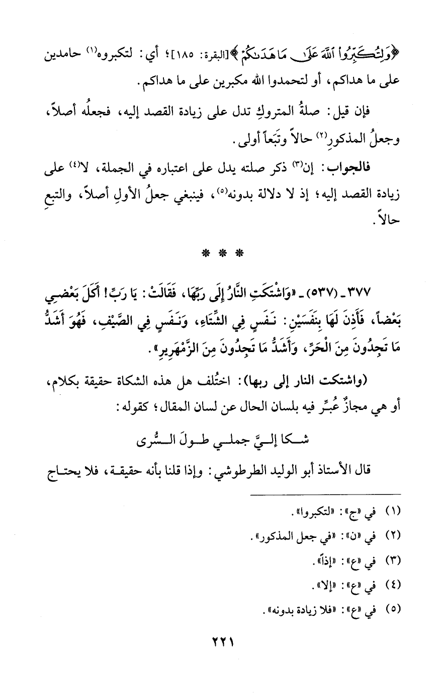 (واشتكت النَّار إلى ربها): اختُلف هل هذه الشكاة حقيقة بكلام، أو هي مجازٌ عُبِّر فيه بلسان الحال عن لسان المقال؛ كقوله:
