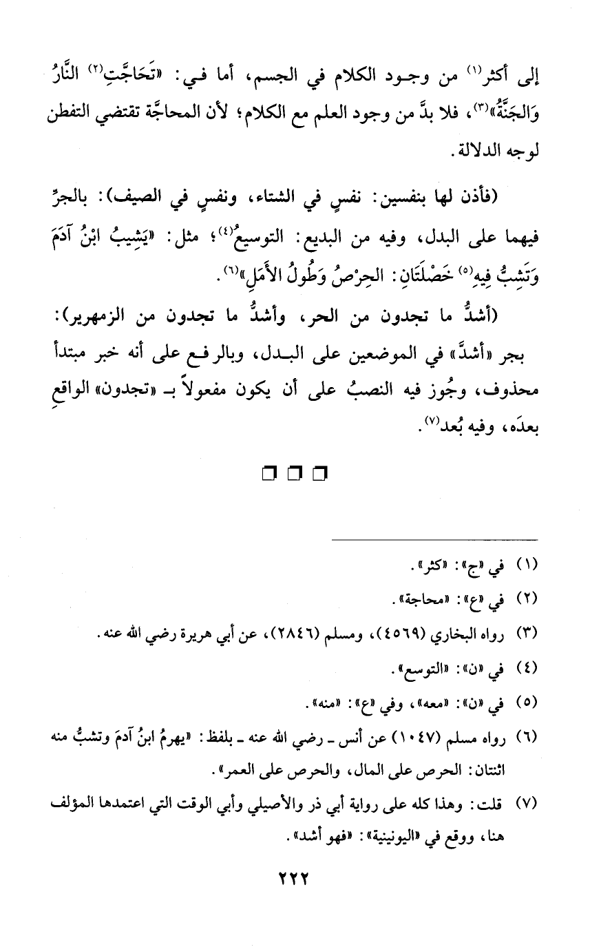 (¬6) رواه مسلم (1047) عن أنس -رَضِيَ الله عَنْهُ- بلفظ: "يهرمُ ابنُ آدمَ وتشبُّ منه اثنتان: الحرص على المال، والحرص على العمر".