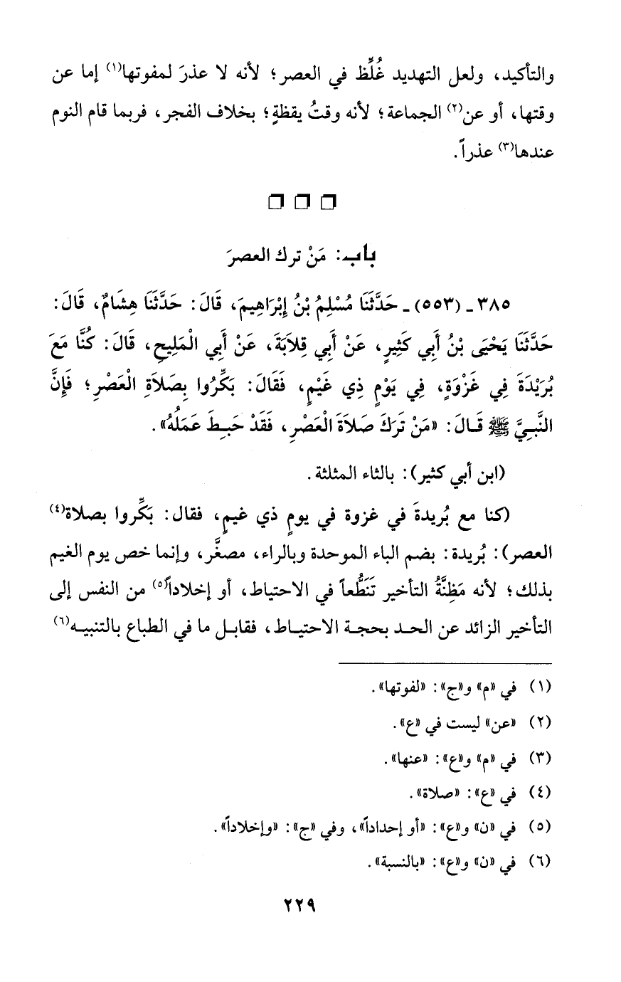 385 - (553) - حَدَّثَنَا مُسْلِمُ بْنُ إِبْرَاهِيمَ، قَالَ: حَدَّثَنَا هِشَامٌ، قَالَ: حَدَّثَنَا يَحْيَى بْنُ أَبي كَثِيرٍ، عَنْ أَبِي قِلَابَةَ، عَنْ أَبي الْمَلِيح، قَالَ: كُنَّا مَعَ بُرَيْدَةَ في غَزْوَةٍ، في يَوْمٍ ذِي غَيْمٍ، فَقَالَ: بَكِّرُوا بِصَلاةِ الْعَصْرِ؛ فَإِنَّ النَّبِيَّ - صلى الله عليه وسلم - قَالَ: "مَنْ تَرَكَ صَلَاةَ الْعَصْرِ، فَقَدْ حَبِطَ عَمَلُهُ".