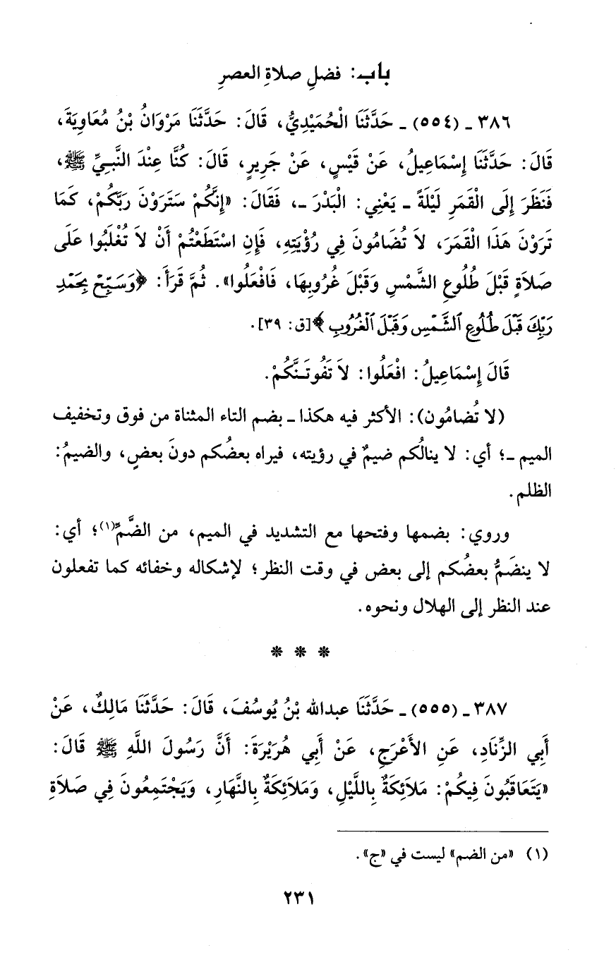 386 - (554) - حَدَّثَنَا الْحُمَيْدِيُّ، قَالَ: حَدَّثَنَا مَرْوَانُ بْنُ مُعَاوِيَةَ، قَالَ: حَدَّثَنَا إِسْمَاعِيلُ، عَنْ قَيْسٍ، عَنْ جَرِيرٍ، قَالَ: كُنَّا عِنْدَ النَّبِيِّ - صلى الله عليه وسلم -، فَنَظَرَ إِلَى الْقَمَرِ لَيْلَةً -يَعْنِي: الْبَدْرَ-، فَقَالَ: "إِنَّكُمْ سَتَرَوْنَ رَبُّكُمْ، كمَا تَرَوْنَ هَذَا الْقَمَرَ، لا تُضَامُونَ في رُؤْيَتِهِ، فَإِنِ اسْتَطَعْتُمْ أَنْ لا تُغْلَبُوا عَلَى صَلاةٍ قَبْلَ طُلُوعِ الشَّمْسِ وَقَبْلَ غُرُوبِهَا، فَافْعَلُوا". ثُمَّ قَرَأَ: {وَسَبِّحْ بِحَمْدِ رَبِّكَ قَبْلَ طُلُوعِ الشَّمْسِ وَقَبْلَ الْغُرُوبِ} [ق:39].