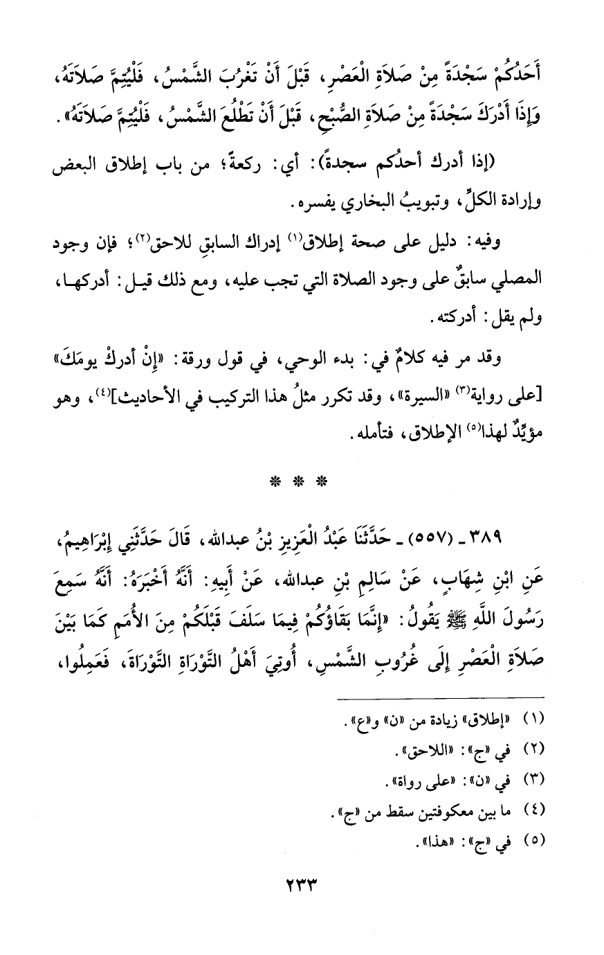 389 - (557) - حَدَّثَنَا عَبْدُ الْعَزِيزِ بْنُ عبد الله، قَالَ حَدَّثَنِي إِبْرَاهِيمُ، عَنِ ابْنِ شِهَابٍ، عَنْ سَالِم بْنِ عبد الله، عَنْ أَبيهِ: أَنَّهُ أَخْبَرَهُ: أَنَّهُ سَمِعَ رَسُولَ اللهِ - صلى الله عليه وسلم - يَقُولُ: "إِنَّمَا بَقَاؤُكُمْ فِيمَا سَلَفَ قَبْلَكُمْ مِنَ الأُمَم كَمَا بَيْنَ صَلاةِ الْعَصْرِ إِلَى غُرُوبِ الشَّمْسِ، أُوتِيَ أَهْلُ التَّوْرَاةِ التَّوْرَاةَ، فَعَمِلُوا،
