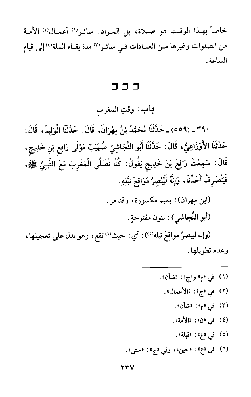 390 - (559) - حَدَّثَنَا مُحَمَّدُ بْنُ مِهْرَانَ، قَالَ؛ حَدَّثَنَا الْوَلِيدُ، قَالَ: حَدَّثَنَا الأَوْزَاعِيُّ، قَالَ: حَدَّثَنَا أَبُو النَّجَاشِيِّ صُهَيْبٌ مَوْلَى رَافِعِ بْنِ خَدِيجٍ، قَالَ: سَمِعْتُ رَافِعَ بْنَ خَدِيجٍ يَقُولُ: كُنَّا نُصَلِّي الْمَغْرِبَ مَعَ النَّبِيِّ - صلى الله عليه وسلم -، فَيَنْصَرِفُ أَحَدُنَا، وَإِنَّهُ لَيُبْصِرُ مَوَاقِعَ نبلِهِ.