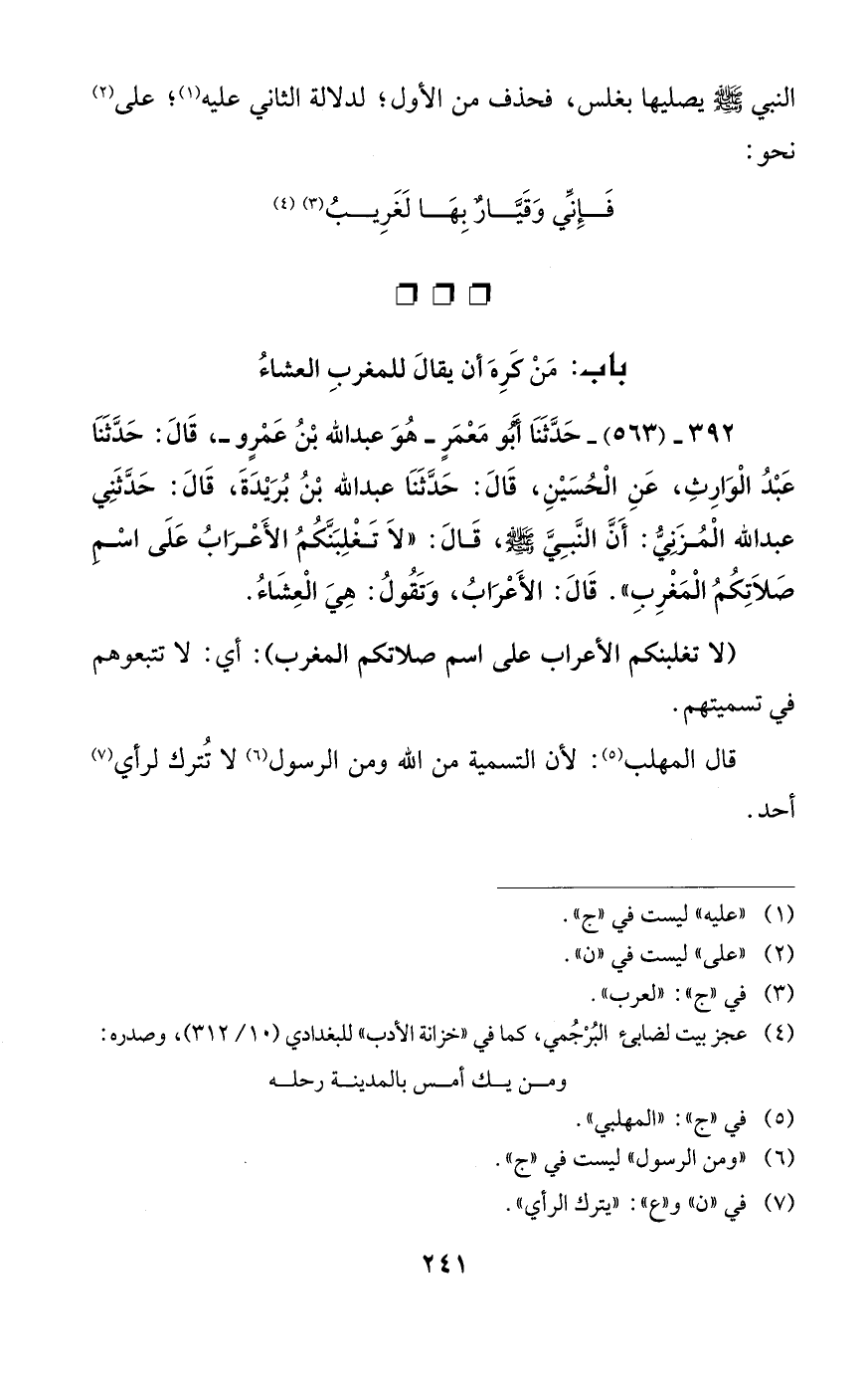 392 - (563) - حَدَّثَنَا أَبُو مَعْمَرٍ -هُوَ عبد الله بْنُ عَمْرٍو-، قَالَ: حَدَّثَنَا عَبْدُ الْوَارِثِ، عَنِ الْحُسَيْنِ، قَالَ: حَدَّثَنَا عبد الله بْنُ بُرَيْدَةَ، قَالَ: حَدَّثَنِي عبد الله الْمُزَنِيُّ: أَنَّ النَّبِيَّ - صلى الله عليه وسلم -، قَالَ: "لا تَغْلِبَنَّكُمُ الأَعْرَابُ عَلَى اسْم صَلاتِكُمُ الْمَغْرِبِ". قَالَ: الأَعْرَابُ، وَتَقُولُ: هِيَ الْعِشَاءُ.