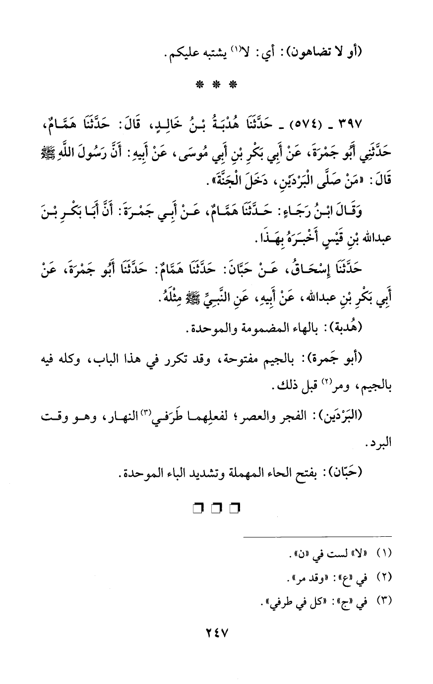 397 - (574) - حَدَّثَنَا هُدْبَةُ بْنُ خَالِدٍ، قَالَ: حَدّثَنَا هَمَّامٌ، حَدَّثَنِي أَبُو جَمْرَةَ، عَنْ أَبي بَكْرِ بْنِ أَبي مُوسَى، عَنْ أَبيهِ: أَنَّ رَسُولَ اللهِ - صلى الله عليه وسلم - قَالَ: "مَنْ صَلَّى الْبَرْديْنِ، دَخَلَ الْجَنَّةَ".