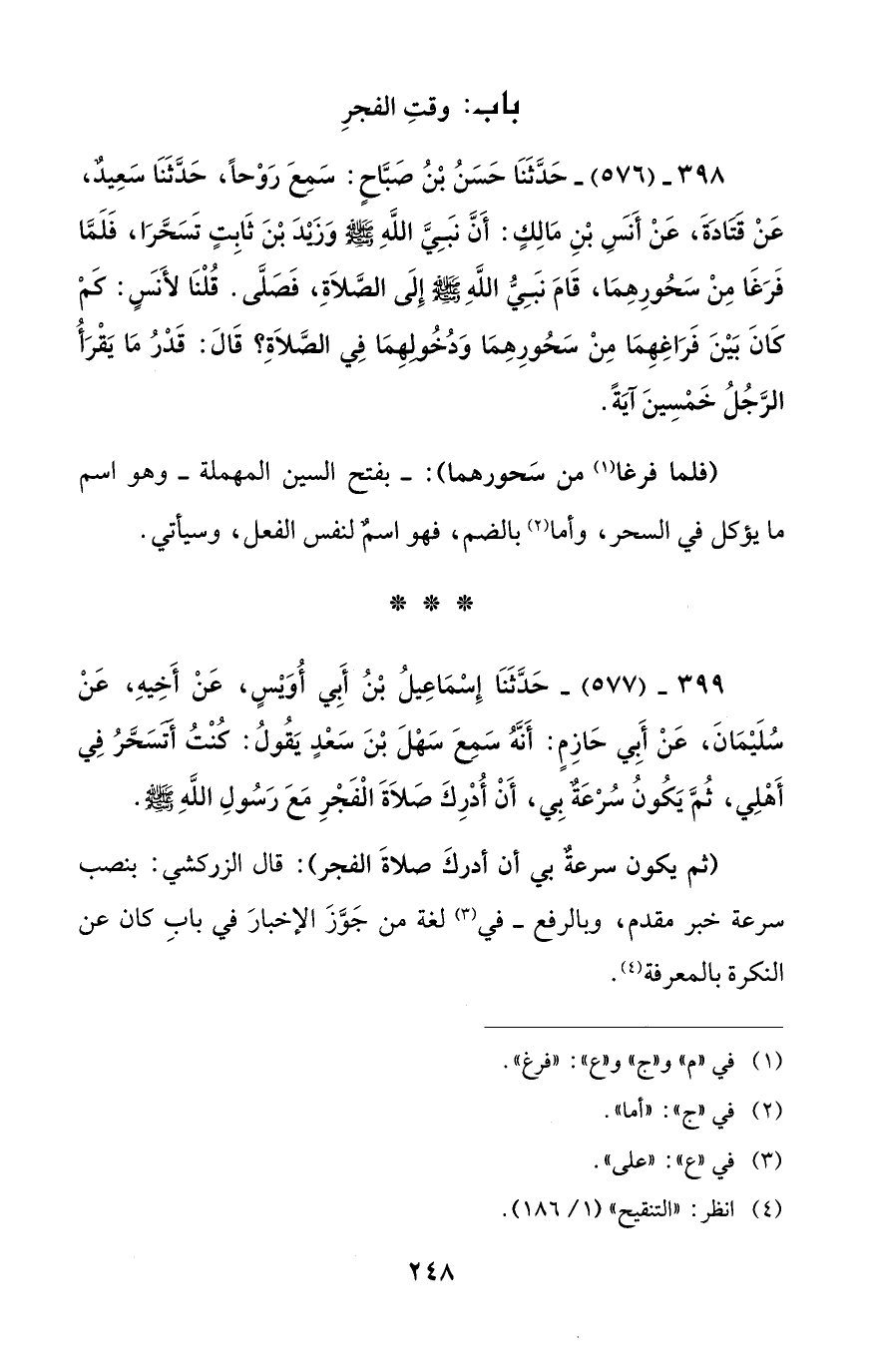398 - (576) - حَدَّثَنَا حَسَنُ بْنُ صَبَّاحٍ: سَمِعَ رَوْحًا، حَدَّثَنَا سَعِيدٌ، عَنْ قتادَةَ، عَنْ أَنسِ بْنِ مَالِكٍ: أَنَّ نبِيَّ اللهِ - صلى الله عليه وسلم - وَزَيْدَ بْنَ ثَابِتٍ تَسَحَّرَا، فَلَمَّا فَرَغَا مِنْ سَحُورِهِمَا، قَامَ نبَيُّ اللهِ - صلى الله عليه وسلم - بها إِلَى الصَّلَاةِ، فَصَلَّى. قُلْنَا لأَنسٍ: كَمْ كَانَ بَيْنَ فَرَاغِهِمَا مِنْ سَحُورِهِمَا وَدُخُولهِمَا في الصَّلاةِ؟ قَالَ: قَدْرُ مَا يَقْرَأُ الرَّجُلُ خَمْسِينَ آية.