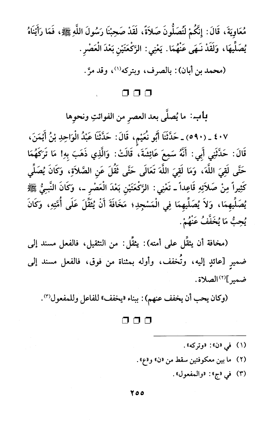 مُعَاوِيَةَ، قَالَ: إِنَّكمْ لَتصَلُّونَ صَلَاةً، لَقَدْ صَحِبْنَا رَسُولَ اللهِ - صلى الله عليه وسلم -، فَمَا رَأَيْنَاهُ يُصَلِّيهَا، وَلَقَدْ نَهَى عَنْهُمَا. يَعْنِي: الرَّكْعَتَيْنِ بَعْدَ الْعَصْرِ.