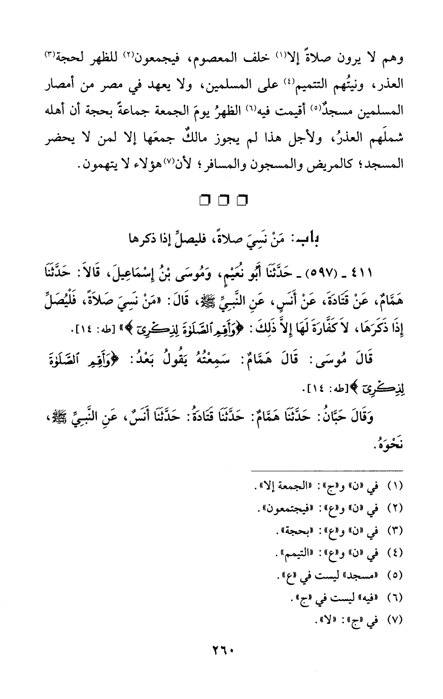411 - (597) - حَدّثَنَا أبو نعيْمِ، وَمُوسَى بْنُ إِسْمَاعِيلَ، قَالَا: حَدَّثَنَا هَمَّامٌ، عَنْ قتادَةَ، عَنْ أَنس، عَنِ النَّبِيّ - صلى الله عليه وسلم -، قَالَ: "مَنْ نسَيَ صَلَاةً، فَلْيُصَلِّ إِذَا ذَكَرَهَا، لا كَفَّارَةَ لَهَا إلا ذَلِكَ: {وَأَقِمِ الصَّلَاةَ لِذِكْرِي} " [طه: 14].