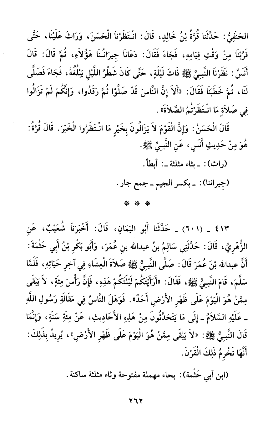 413 - (601) - حَدَّثَنا أَبُو اليَمَانِ، قَالَ: أَخْبَرَنَا شُعَيْبٌ، عَنِ الزُّهْرِيِّ، قَالَ: حَدَّثَنِي سَالِمُ بنُ عبد الله بنِ عُمَرَ، وَأَبُو بَكْرِ بْنُ أَبِي حَثْمَةَ: أَن عبد الله بْنَ عُمَرَ قَالَ: صَلَّى النَّبِيُّ - صلى الله عليه وسلم - صَلَاةَ الْعِشَاءِ في آخِرِ حَيَاتِهِ، فَلَمَّا سَلَّمَ، قَامَ النَّبِيُّ - صلى الله عليه وسلم -، فَقَالَ: "أَرَأَيْتَكُمْ لَيْلَتَكُمْ هَذِهِ، فَإِنَّ رَأْسَ مِئَةٍ، لا يَبْقَى مِمَّنْ هُوَ الْيَوْمَ عَلَى ظَهْرِ الأَرْضِ أَحَد". فَوَهَلَ النَّاسُ في مَقَالَةِ رَسُولِ اللهِ -عَلَيْهِ السَّلامُ- إِلَى مَا يَتَحَدَّثُونَ مِنْ هَذِهِ الأَحَادِيثِ، عَنْ مِئَةِ سَنَةٍ، وَإِنَّمَا قَالَ النَّبِيُّ - صلى الله عليه وسلم -: "لا يَبْقَى مِمَّنْ هُوَ الْيَوْمَ عَلَى ظَهْرِ الأَرْضِ"، يُرِيدُ بِذَلِكَ: أَنَّهَا تَخْرِمُ ذَلِكَ الْقَرْنَ.