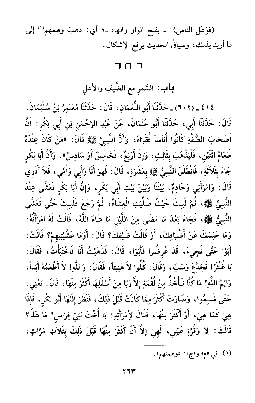 414 - (602) - حَدَّثَنَا أَبُو النُّعْمَانِ، قَالَ: حَدَّثَنَا مُعْتَمِرُ بْنُ سُلَيْمَانَ، قَالَ: حَدَّثَنَا أَبِي، حَدَّثَنَا أَبُو عُثْمَانَ، عَنْ عَبْدِ الرَّحْمَنِ بْنِ أَبي بَكْرٍ: أَنَّ أَصْحَابَ الصُّفَّةِ كَانُوا أُنَاسًا فُقَرَاءَ، وَأَنَّ النَّبِيَّ - صلى الله عليه وسلم - قَالَ: "مَنْ كَانَ عِنْدَهُ طَعَامُ اثْنَيْنِ، فَلْيَذْهَبْ بِثَالِثٍ، وَإِنْ أَرْبَعٌ، فَخَامِسٌ أَوْ سَادِسٌ". وَأَنَّ أَبَا بَكْرٍ جَاءَ بِثَلَاثَةٍ، فَانْطَلَقَ النَّبِيُّ - صلى الله عليه وسلم - بِعَشَرَةٍ، قَالَ: فَهْوَ أَنَا وَأَبي وَأُمِّي، فَلَا أَدْرِي قَالَ: وَامْرَأَتِي وَخَادِمٌ، بَيْنَنَا وَبَيْنَ بَيْتِ أَبِي بَكْرٍ، وَإِنَّ أَبَا بَكْرٍ تَعَشَّى عِنْدَ النَّبِيِّ - صلى الله عليه وسلم -، ثُمَّ لَبِثَ حَيْثُ صُلِّيَتِ الْعِشَاءُ، ثُمَّ رَجَعَ فَلَبِثَ حَتَّى تَعَشَّى النَّبِيُّ - صلى الله عليه وسلم -، فَجَاءَ بَعْدَ مَا مَضَى مِنَ اللَّيْلِ مَا شَاءَ الله، قَالَتْ لَهُ امْرَأتهُ: وَمَا حَبَسَكَ عَنْ أَضْيَافِكَ، أَوْ قَالَتْ ضَيْفِكَ؟ قَالَ: أَوَمَا عَشَّيْتِيهِمْ؟ قَالَتْ: أَبَوْا حَتَّى تَجيءَ، قَدْ عُرِضُوا فَأَبَوْا، قَالَ: فَذَهَبْتُ أَنَا فَاخْتَبَأْتُ، فَقَالَ: يَا غُنْثَرُ! فَجَدَّع وَسَبَّ، وَقَالَ: كُلُوا لا هَنِيئًا، فَقَالَ: وَاللهِ! لا أَطْعَمُهُ أَبَدًا، وَايْمُ اللهِ! مَا كُنَّا نَأْخُذُ مِنْ لُقْمَةٍ إلا رَبَا مِنْ أَسْفَلِهَا أَكثَرُ مِنْهَا، قَالَ: يَعْنِي: حَتَّى شَبِعُوا، وَصَارَتْ أَكثَرَ مِمَّا كَانَتْ قَبْلَ ذَلِكَ، فَنَظَرَ إِلَيْهَا أَبُو بَكْرٍ، فَإِذَا هِيَ كَمَا هِيَ، أَوْ أكثَرَ مِنْهَا، فَقَالَ لأمْرَأَتِهِ: يَا أُخْتَ بَنِيْ فِرَاسٍ! مَا هَذَا؟ قَالَتْ: لا وَقُرَّةِ عَيْني، لَهِيَ إلَّا أَنْ أكثَرَ مِنْهَا قَبْلَ ذَلِكَ بِثَلَاثِ مَرَّاتٍ،