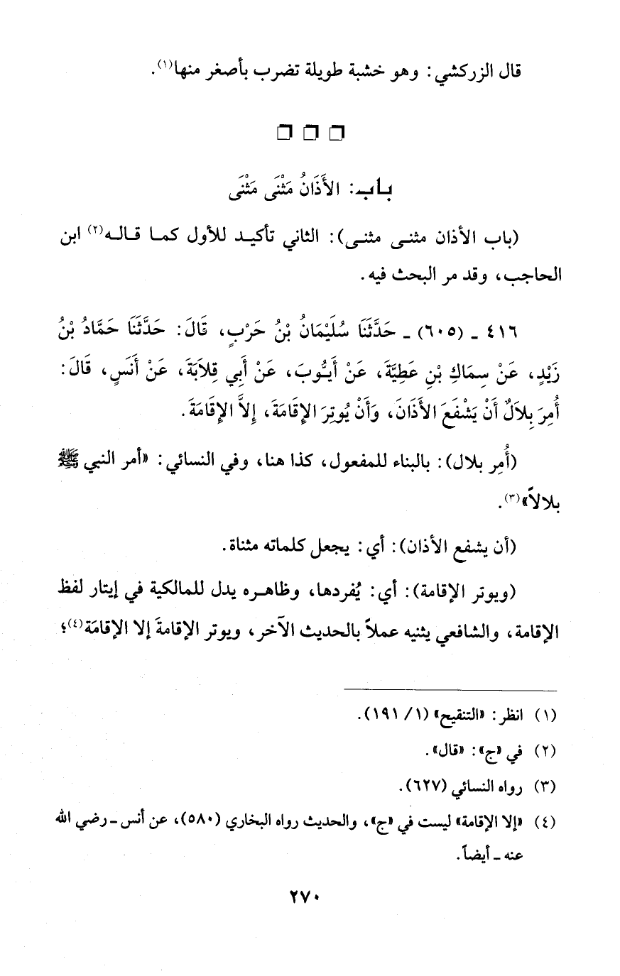 416 - (605) - حَدَّثَنَا سُلَيْمَانُ بْنُ حَرْبٍ، قَالَ: حَدَّثَنَا حَمَّادُ بْنُ زَيْدٍ، عَنْ سِمَاكِ بْنِ عَطِيَّةَ، عَنْ أَيُّوبَ، عَنْ أَبِي قِلَابَةَ، عَنْ أَنسٍ، قَالَ: أُمِرَ بِلَالٌ أَنْ يَشْفَعَ الأَذَانَ، وَأَنْ يُوتِرَ الإقَامَةَ، إلا الإقَامَةَ.