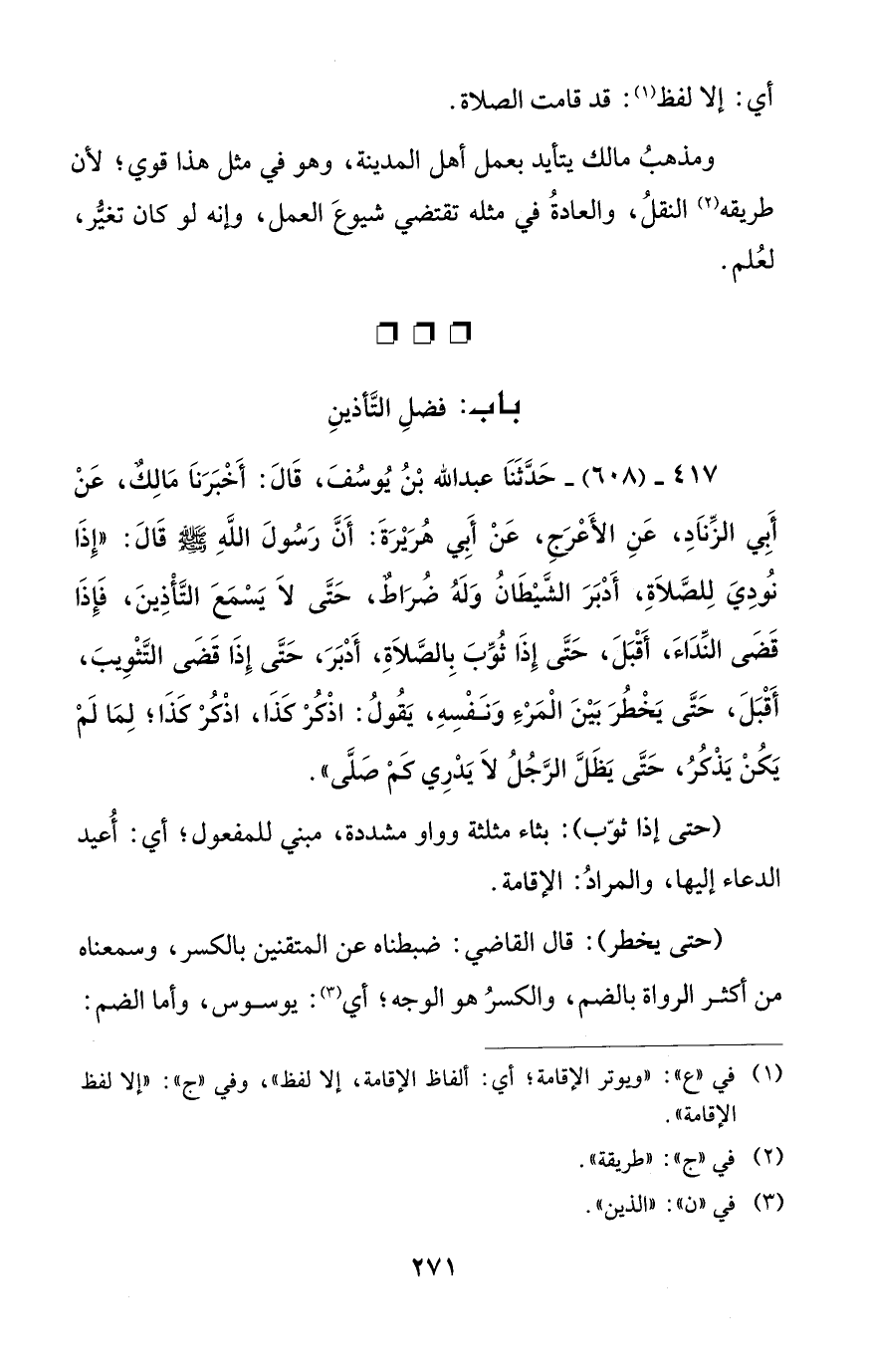417 - (608) - حَدَّثَنَا عبد الله بْنُ يُوسُفَ، قَالَ: أَخْبَرَنَا مَالِكٌ، عَنْ أَبِي الزِّنَادِ، عَنِ الأَعْرَجِ، عَنْ أَبي هُرَيْرَةَ: أَنَّ رَسُولَ اللهِ - صلى الله عليه وسلم - قَالَ: "إِذَا نُودِيَ لِلصَّلَاةِ، أَدْبَرَ الشَّيْطَانُ وَلَهُ ضُرَاطٌ، حَتَّى لا يَسْمَعَ التَّأْذِينَ، فَإِذَا قَضَى النِّدَاءَ، أَقْبَلَ، حَتَّى إِذَا ثُوِّبَ بِالصَّلَاةِ، أَدْبَرَ، حَثَّى إِذَا قَضَى التَّثْوِيبَ، أَقْبَلَ، حَتَّى يَخْطُرَ بَيْنَ الْمَرْءِ وَنَفْسِهِ، يَقُولُ: اذْكُرْ كَذَا، اذْكُرْ كذَا؛ لِمَا لَمْ يَكُنْ يَذْكرُ، حَتَّى يَظَلَّ الرَّجُلُ لا يَدْرِي كَمْ صَلَّى".