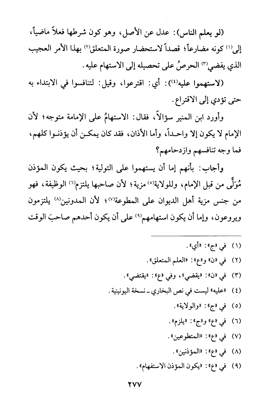وأجاب: بأنهم إما أن يستهموا على التولية؛ بحيث يكون المؤذن مُوَلًّى من قبل الإِمام، وللولاية (¬5) مزية؛ لأن صاحبها يلتزم (¬6) الوظيفة، فهو من جنس مزية أهل الديوان على المطوعة (¬7)؛ لأن المدونين (¬8) يلتزمون ويروعون، وإما أن يكون استهامهم (¬9) على أن يكون أحدهم صاحبَ الوقت