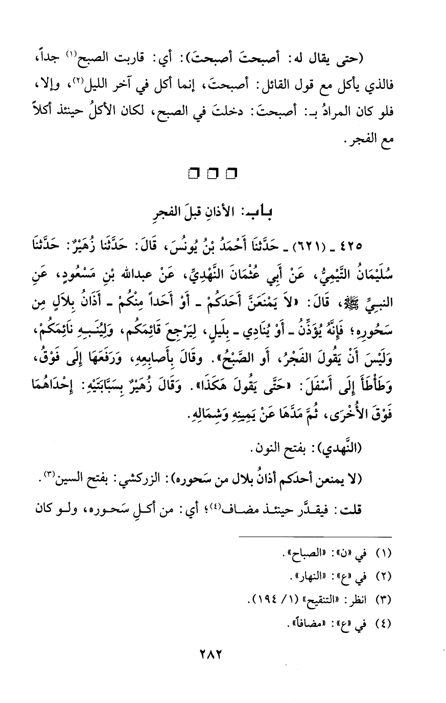 425 - (621) - حَدَّثنَا أَحْمَدُ بْنُ يُونُسَ، قَالَ: حَدَّثَنا زُهَيْرٌ: حَدَّثنَا سُلَيْمَانُ التَّيْمِيُّ، عَنْ أَبِي عُثْمَانَ النَّهْدِيِّ، عَنْ عبد الله بْنِ مَسْعُودٍ، عَنِ النبِيِّ - صلى الله عليه وسلم -، قَالَ: "لا يَمْنَعَنَّ أَحَدُكُمْ -أَوْ أَحَدًا مِنْكُمْ- أَذَانُ بِلَالٍ مِن سَحُورِهِ؛ فَإِنَّهُ يُؤَذِّنُ -أَوْ يُنَادِي- بِلَيلٍ، لِيَرْجِعَ قَائِمَكُم، وَلِيُنَبِهِ نَائِمَكُمْ، وَلَيْسَ أَنْ يَقُولَ الفَجْرُ، أَو الصَّبْحُ". وقَالَ بِأَصابِعِهِ، وَرَفَعَهَا إِلَى فَوْقُ، وَطَاْطَأَ إِلَى أَسْفَلَ: "حَتَّى يَقُولَ هَكَذَا". وَقَالَ زُهَيْرٌ بِسَبَّابَتَيْهِ: إِحْدَاهُمَا فَوْقَ الأُخْرَى، ثُمَّ مَدَّهَا عَنْ يَمِينهِ وَشِمَالِهِ.