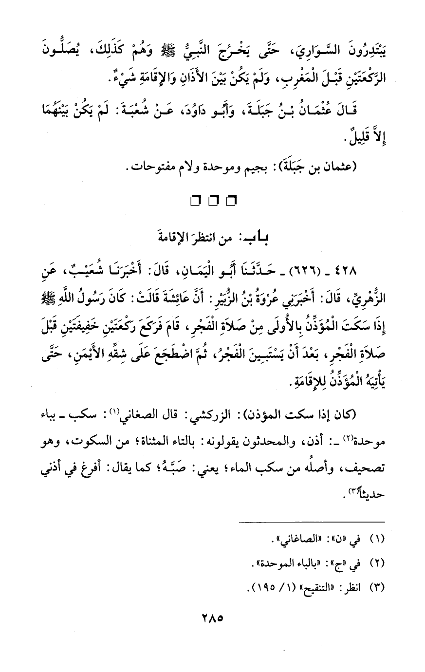 428 - (626) - حَدَّثَنَا أَبُو الْيَمَانِ، قَالَ: أَخْبَرَنَا شُعَيبٌ، عَنِ الزُّهْرِيِّ، قَالَ: أَخْبَرَني عُرْوَةُ بْنُ الزُّبَيْرِ: أَنَّ عَائِشَةَ قَالَتْ: كَانَ رَسُولُ اللهِ - صلى الله عليه وسلم - إِذَا سَكَتَ الْمُؤَذِّنُ بِالأُولَى مِنْ صَلَاةِ الْفَجْرِ، قَامَ فَرَكَعَ رَكعَتَيْنِ خَفِيفَتَيْنِ قَبْلَ صَلَاةِ الْفَجْرِ، بَعْدَ أَنْ يَسْتَبِينَ الْفَجْرُ، ثُمَّ اضْطَجَعَ عَلَى شِقِّهِ الأَيْمَنِ، حَتَّى يَأْتِيَهُ الْمُؤَذِّنُ لِلإقَامَةِ.